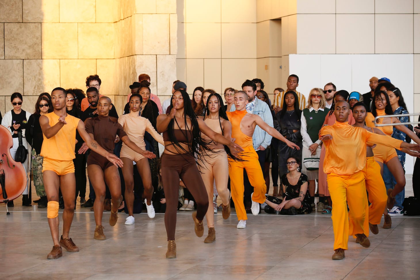 LOS ANGELES — It’s sunset at the Getty Center, and the breathtaking views of the Santa Monica Mountains and the city below are awash in warm tones. The natural light pairs perfectly with a troupe of dancers and musicians dressed in shades of gold and brown, who are currently performing on a terrace overlooking the central garden lawn. This is a preview “Bridge-s,” a new work directed and composed by Solange and choreographed by modernist dance duo Gerard & Kelly.