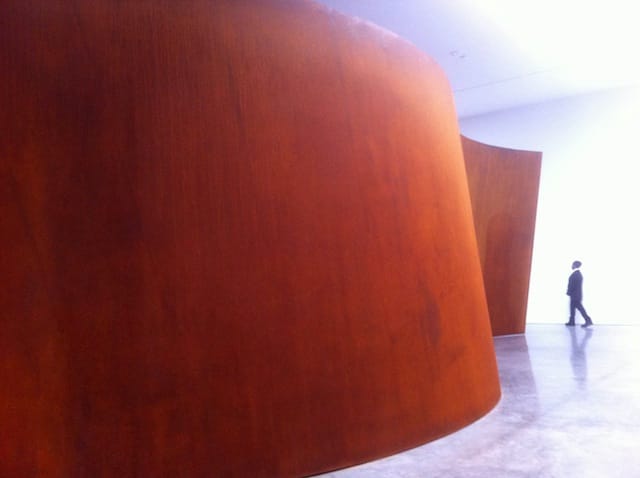 Here, Serra seems to agree with Frank Stella’s famous dictum about painting: “What you see is what you see.” Though, I would add that Serra most likely would include the sensations of the body, “What you physically feel is what you physically feel.” By framing the nature of his work so clearly and starkly, as well as narrowly defining what you are supposed to experience, is Serra being authoritarian? Does it mean that you are stupid or uninformed if you don’t have the right experience? What about the artist’s insistent separation of body and mind–that the work is a purely bodily experience in which the mind seems like extra baggage? What is it about this stance that so many find appealing?