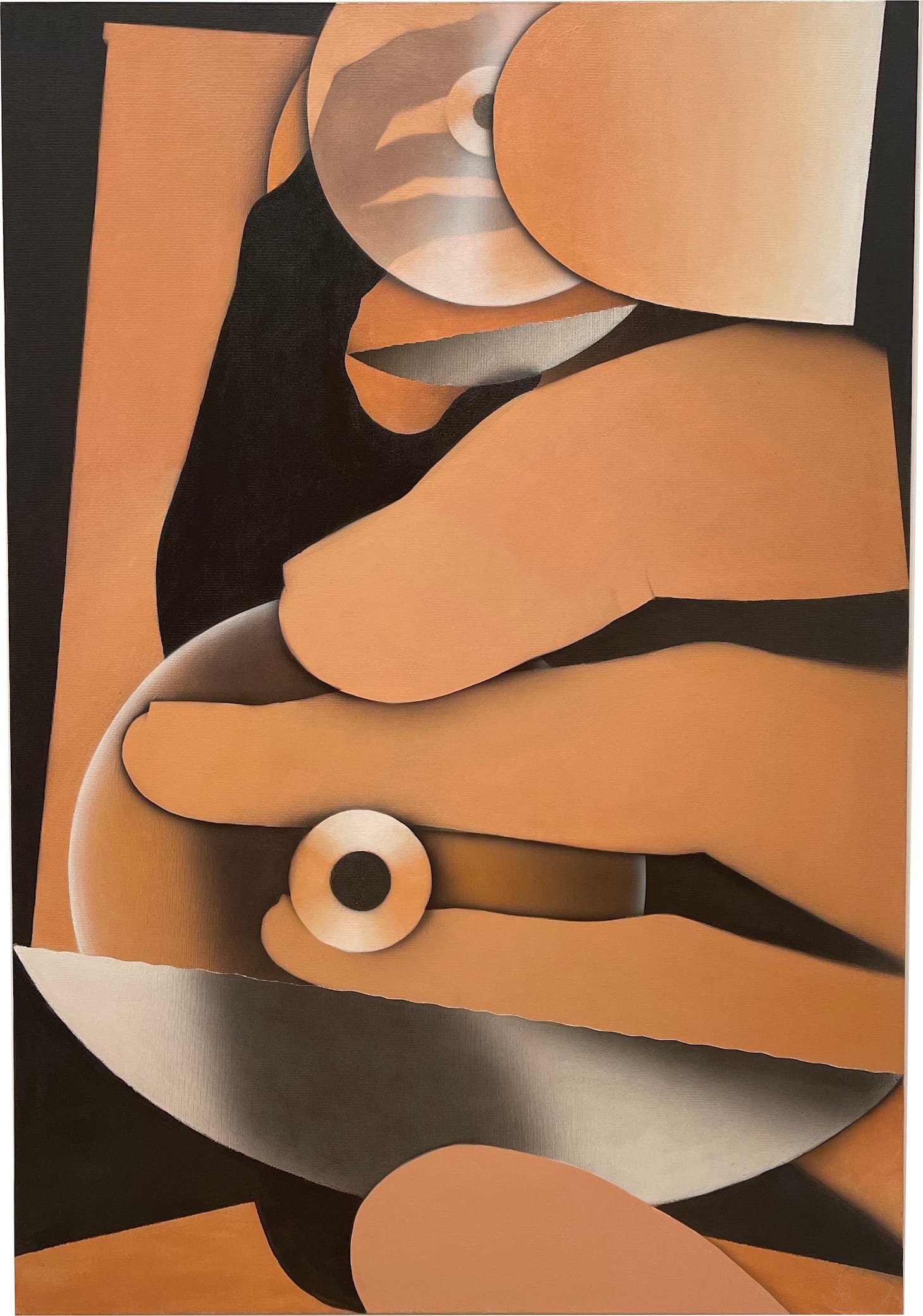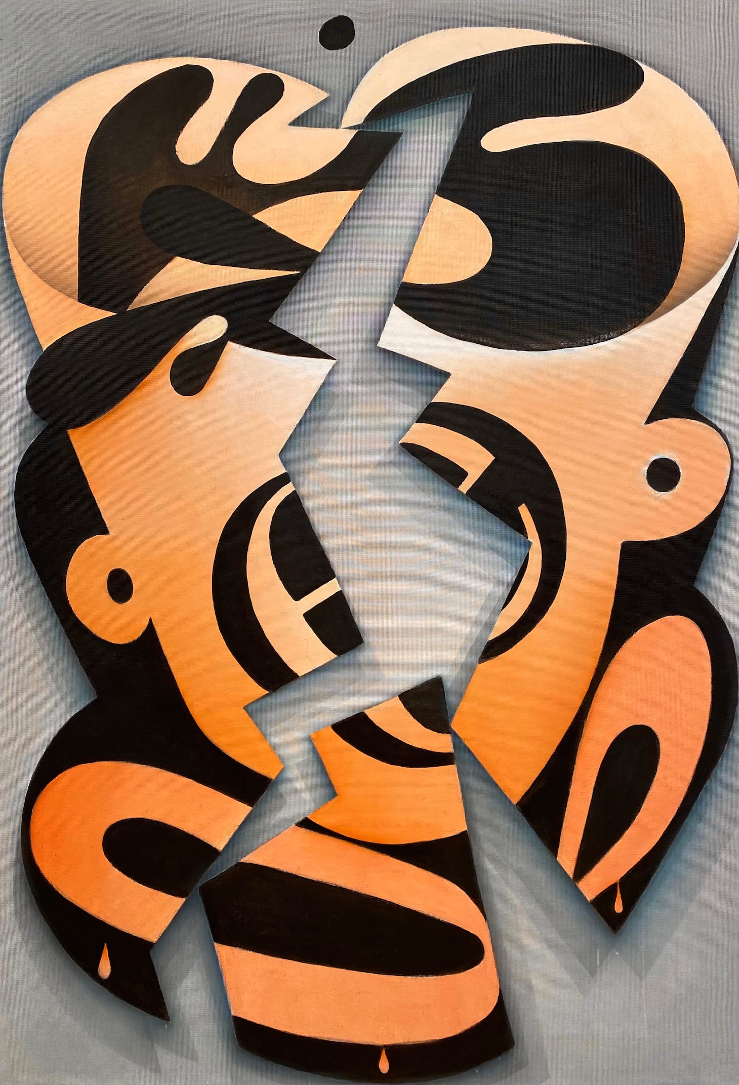 This feeling of disquiet is underscored by the painting, “Expresso” (2021), Worth’s deeply moving homage to Elizabeth Murray. In “Expresso,” with its palette of black and washed out-orange, he depicts a broken espresso cup, the break calling to mind a lightning bolt. One thing that has always struck me about Murray’s paintings of broken coffee cups and spilling liquids is how much domestic turmoil they evoke, and how often reviewers tended to focus on the cartoony side of the work, rather than what may be the deeper subject. By working with a limited, decidedly non-Murray palette, Worth shifts our attention to the broken form.