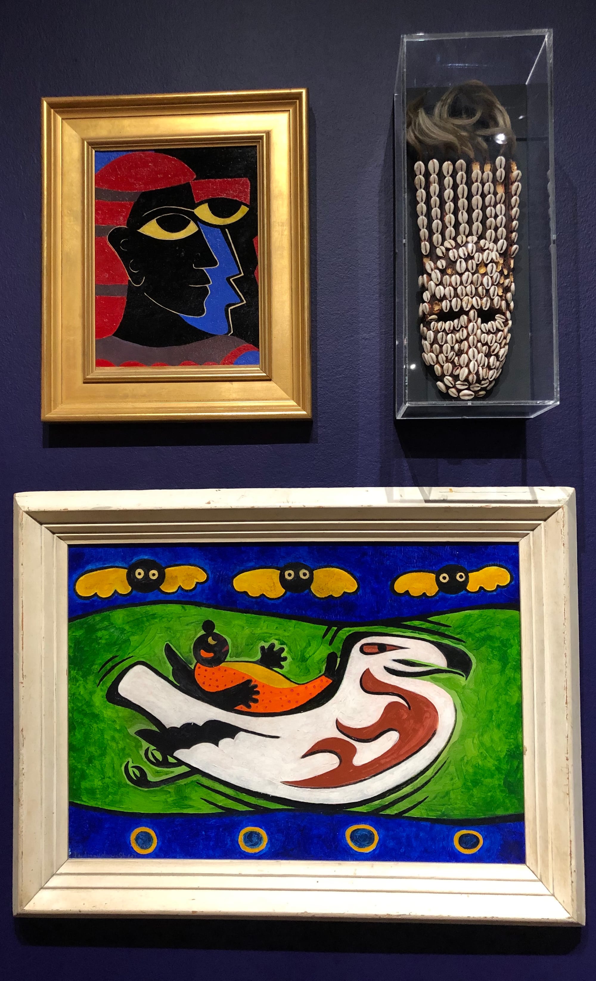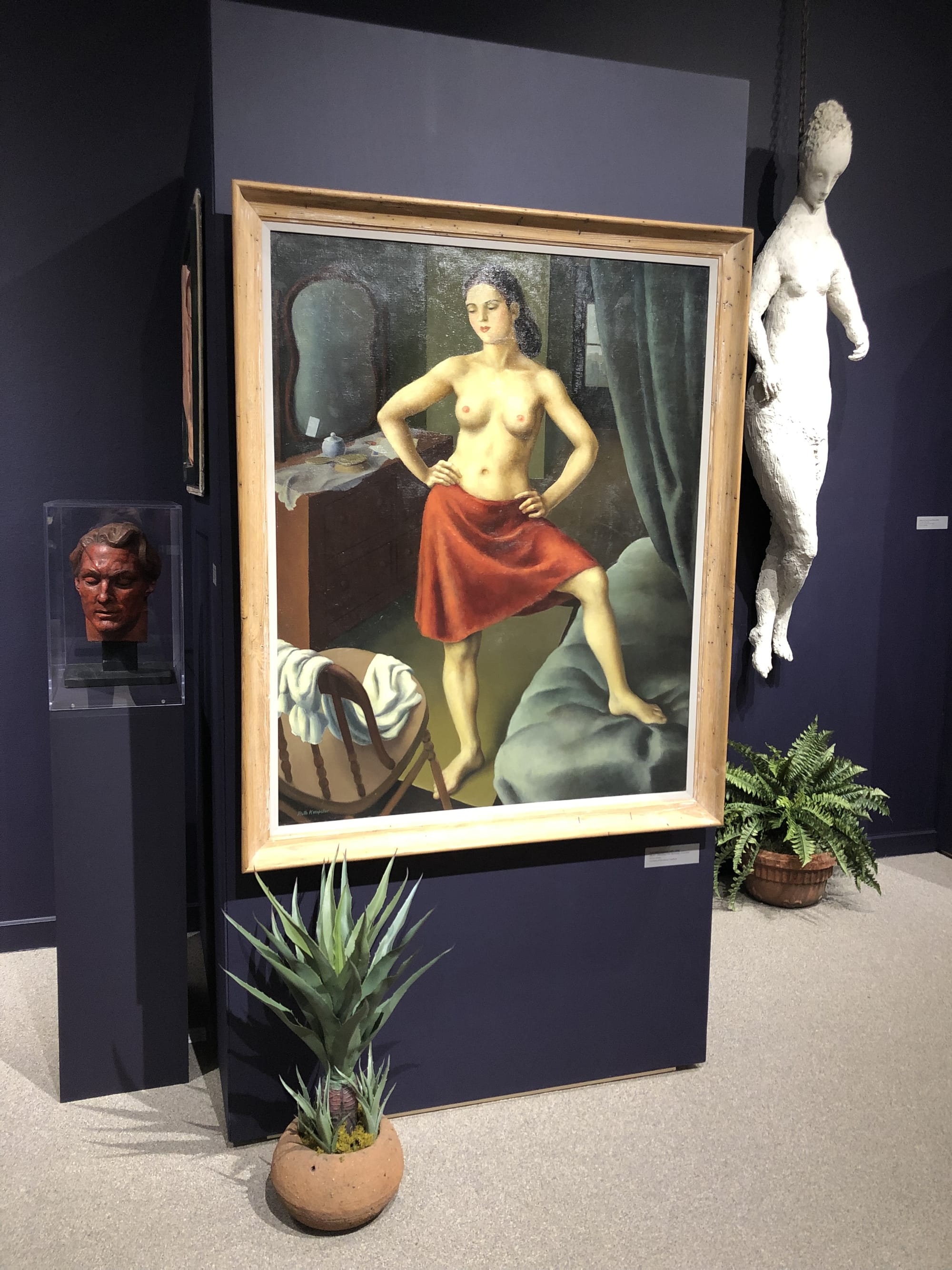 While women artists of color don’t appear as frequently in the exhibition’s early historical record, a rare still-life painting from 1890 by Pauline Powell Burns, the first African American artist to exhibit in California, is featured in the museum. A descendent of Joseph Fossett, a blacksmith who worked as a slave under Thomas Jefferson, Powell Burns was a renowned pianist in addition to being a painter whose early death at 40 years old cut short what was otherwise a remarkable career as a largely self-taught artist. Another black woman artist in the exhibition, Beulah Ecton Woodard, was the first African American artist to have a solo exhibition at the Los Angeles Museum of History, Science and Art (later to become the Los Angeles County Museum of Art). An undated work, “Cowrie Shell Mask,” is representative of Woodard’s creative output inspired by Central and West African cultures. Multi-disciplinary artist, folklorist, and educator Thelma Johnson Streat, whose art is featured alongside Woodard’s, combined modernist forms and folk traditions in her work while pioneering visual arts education programs that celebrated the historical legacies of African Americans.