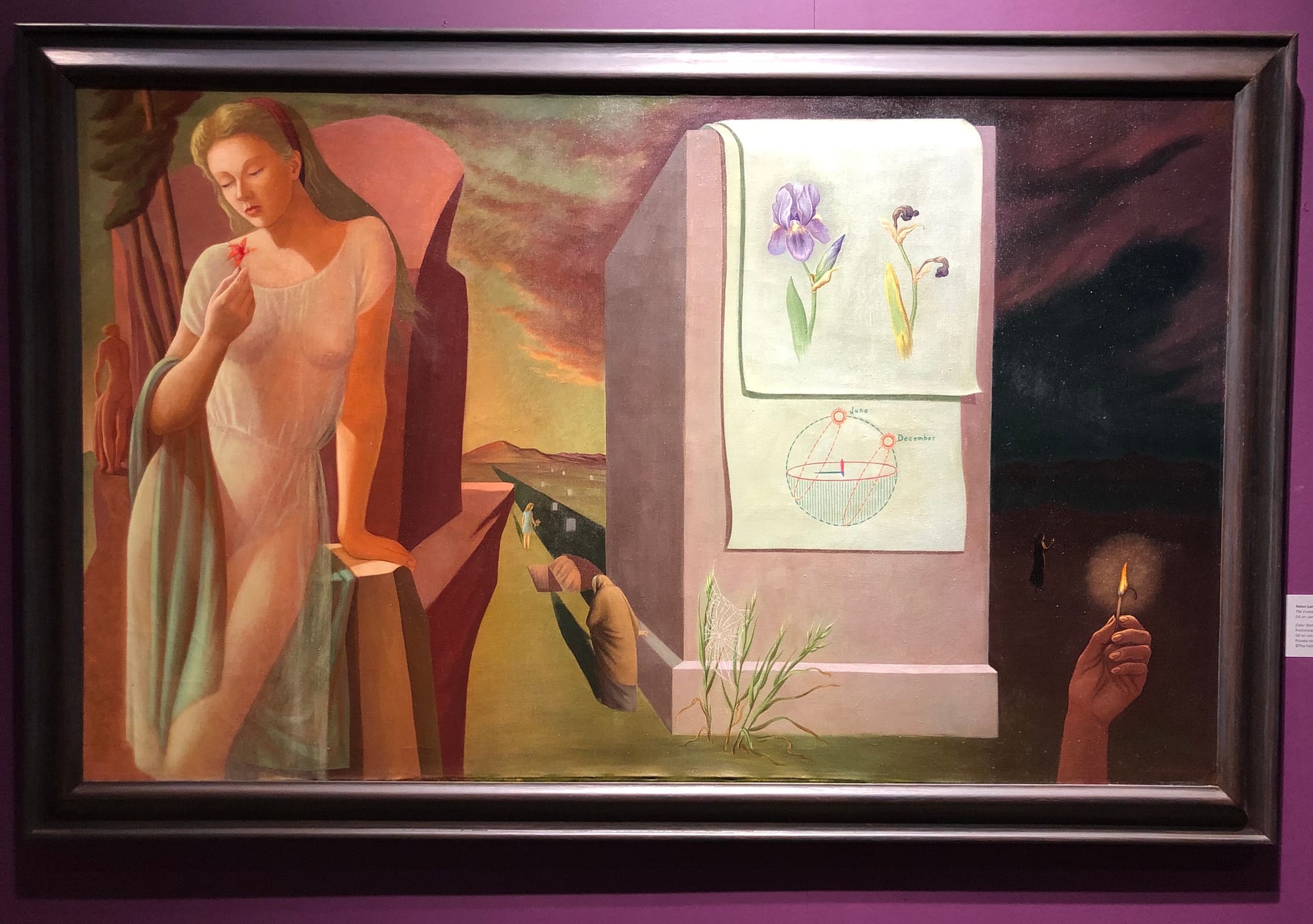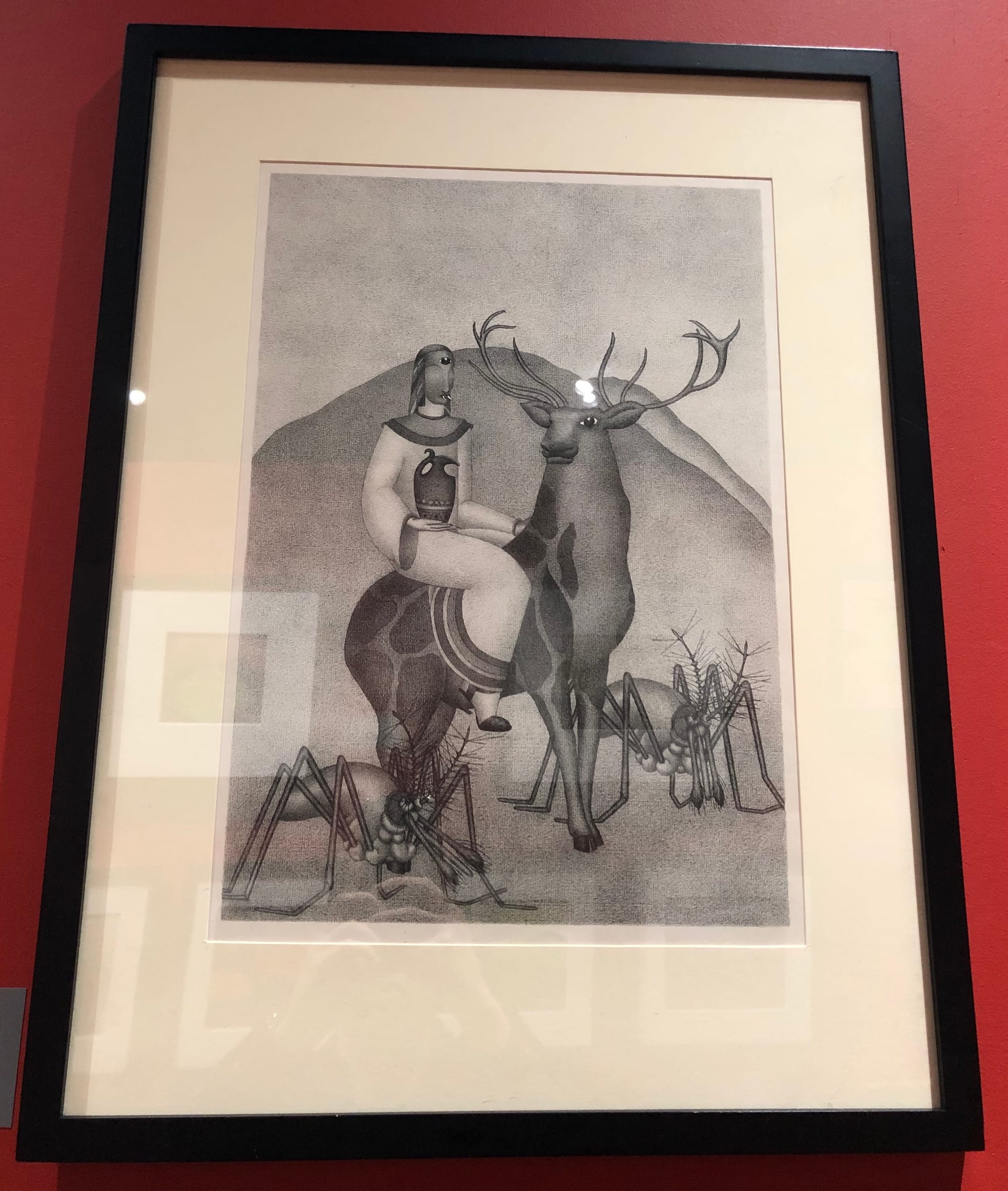 Like Woodard and Streat, not all artists in the exhibition went unrecognized during their lifetimes. Animator and set designer Mary Blair had a successful career working for Walt Disney, creating concept art and character designs for classic animated features like Peter Pan and Alice in Wonderland, examples of which are presented in the museum. Painters Helen Lundeberg, Dorr Bothwell, and Grace Richardson Clements are also credited as innovators of Post-surrealism, an American school of art that both drew inspiration and broke away from the early 20th century Surrealism of European artists like André Breton. Far less, however, is known about artists like Kathleen Taylor Upper, whose lithographs on paper depict equally surreal and sometimes unsettling imagery of the enigmatic and grotesque, or Boza Hessova, whose 1935 painting “Rising and Vanishing Hollywood” captures the growing (and still continuing) tension between the city’s suburban idyll and urban density.