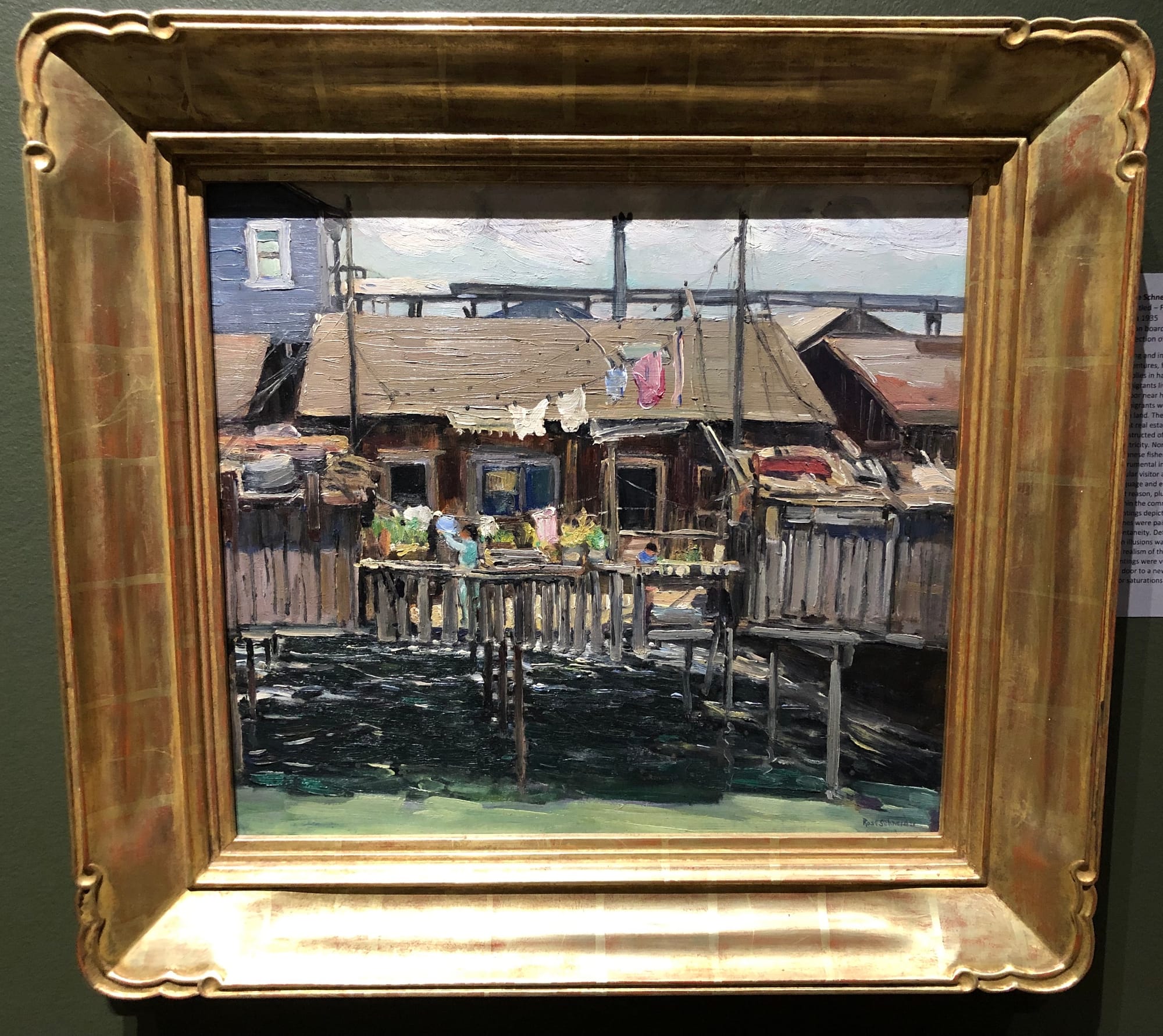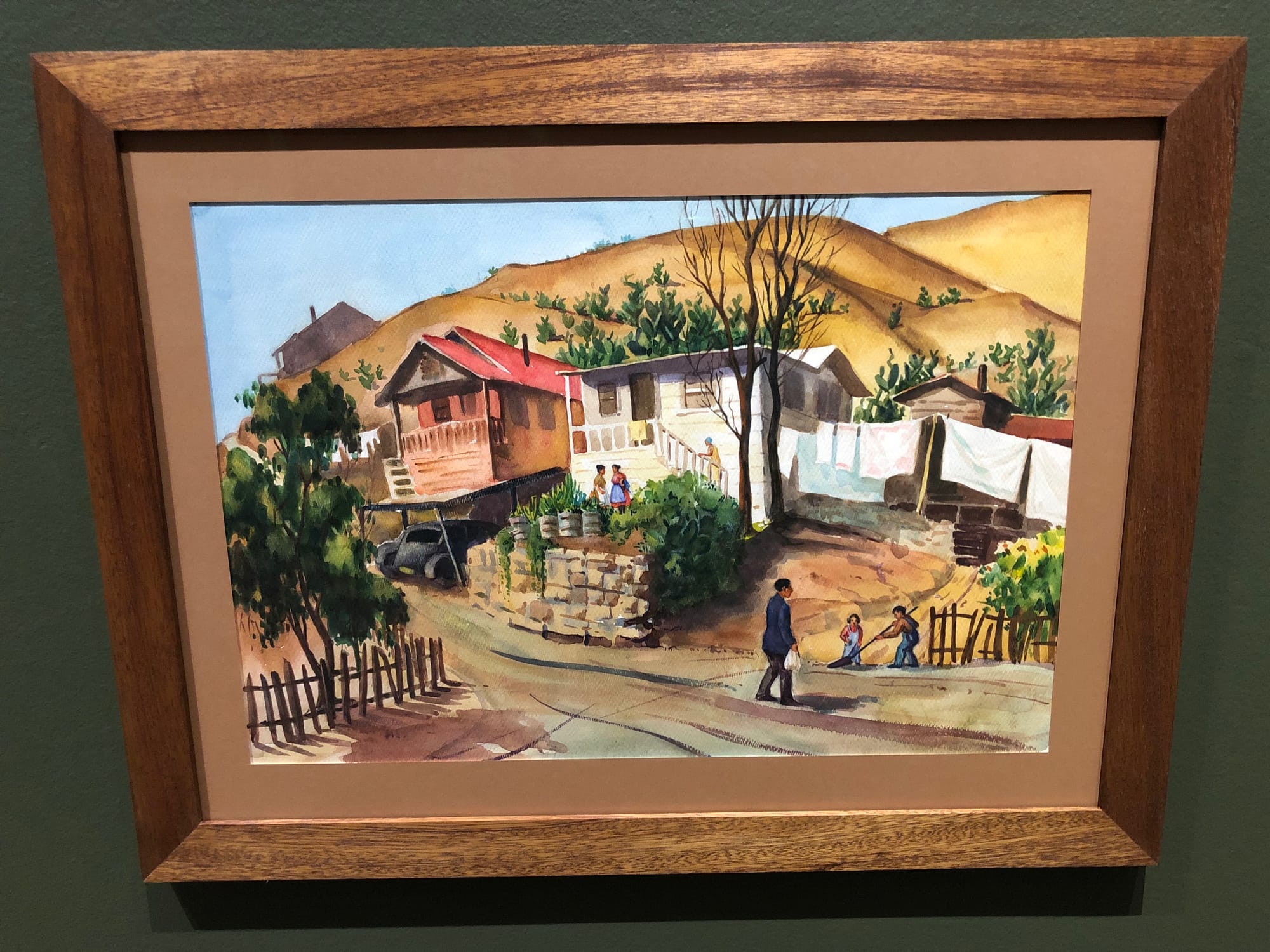 The relationship of these artists to the communities of color they depict aren’t always clear, but in the caption of an untitled painting from 1935 by Rose Schneider, which represents a neighborhood of Japanese immigrants who lived alongside the canneries of San Diego Harbor, we learn that the artist was close with families who’d been forced to live in shantytowns due to discriminatory housing policies. A regular visitor to these fish camps, Schneider produced an entire series of oil paintings documenting the lives of Japanese immigrants whose livelihoods by the sea would ultimately be disrupted by their placement in internment camps during World War II.