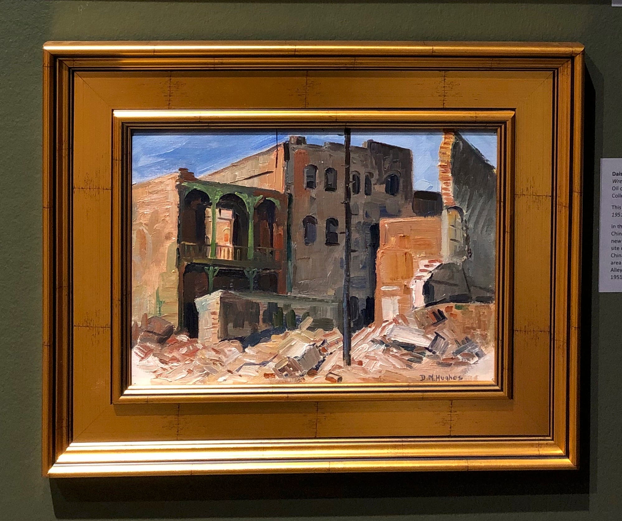 Several paintings in the exhibition serve as historical records of communities long transformed or disappeared. Depictions of Los Angeles’s early Chinatown — before and after its redevelopment as part of the city’s construction of Union Station — appear frequently, although it’s Daisy M. Hughes’s “Wrecking Old Chinatown” from 1951 that marks the near-disappearance of the city’s first neighborhood of Chinese railroad workers and immigrants (the Garnier Building, which now houses the Chinese American Museum, is the only remaining edifice of old Chinatown today). Chavez Ravine, another historic community displaced by city developers, also makes an appearance in the form of paintings depicting idyllic scenes of semi-rural, hillside homes, many of which were owned and inhabited by generations of Mexican Americans (construction of Dodger Stadium in the 1950s ultimately led to their eviction).