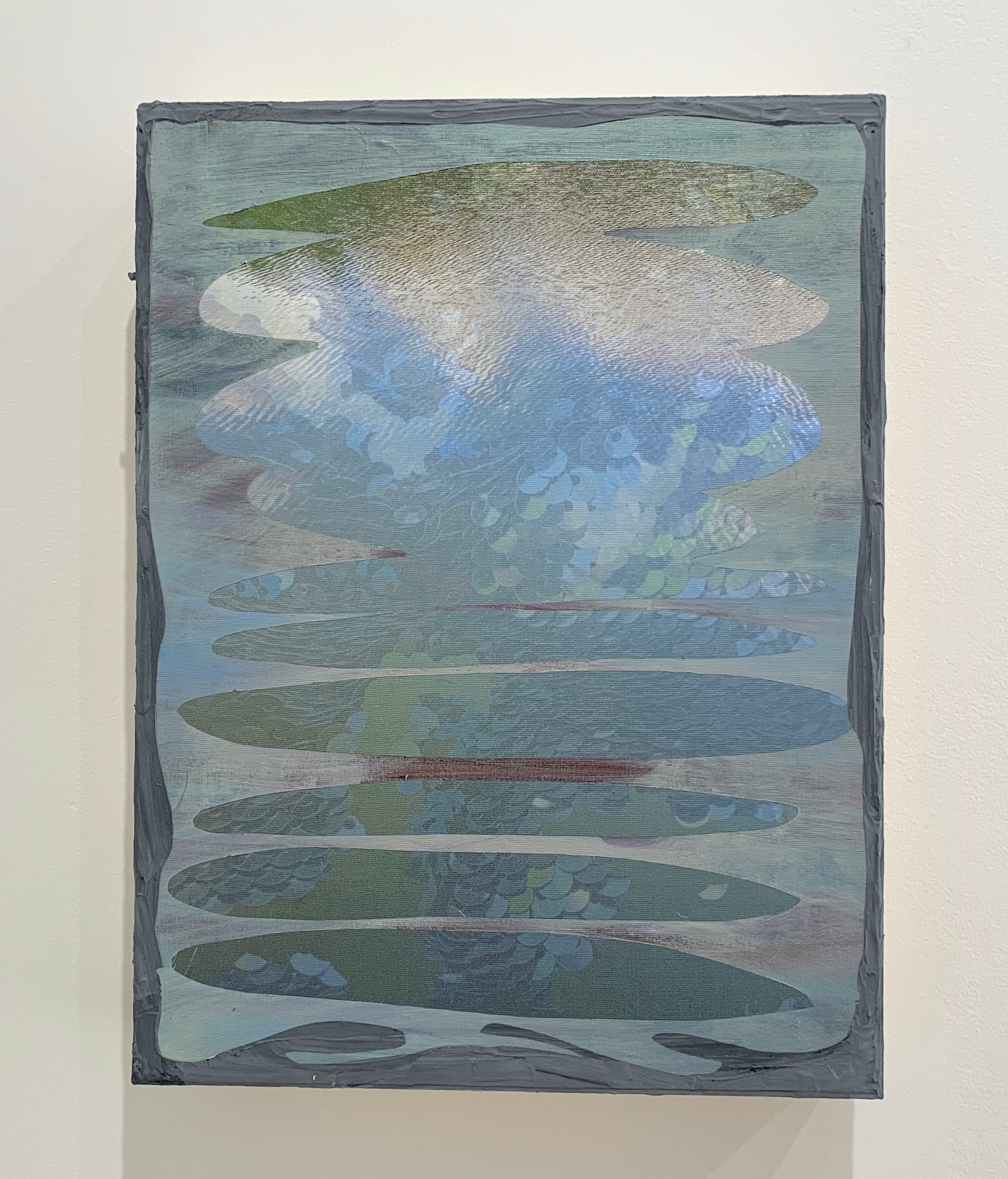 Similarly, in “Fishbrain, what do you think about, when your kitchen’s on fire” (2024), muted sequins glimmer inside an area that’s been masked off to resemble a Zen-like stack of rocks. Peaceful, except that after enough time the aqueous layer of micaceous iron oxide starts to recall an oil spill slowly coating the ocean life with its slick, malevolent sheen.