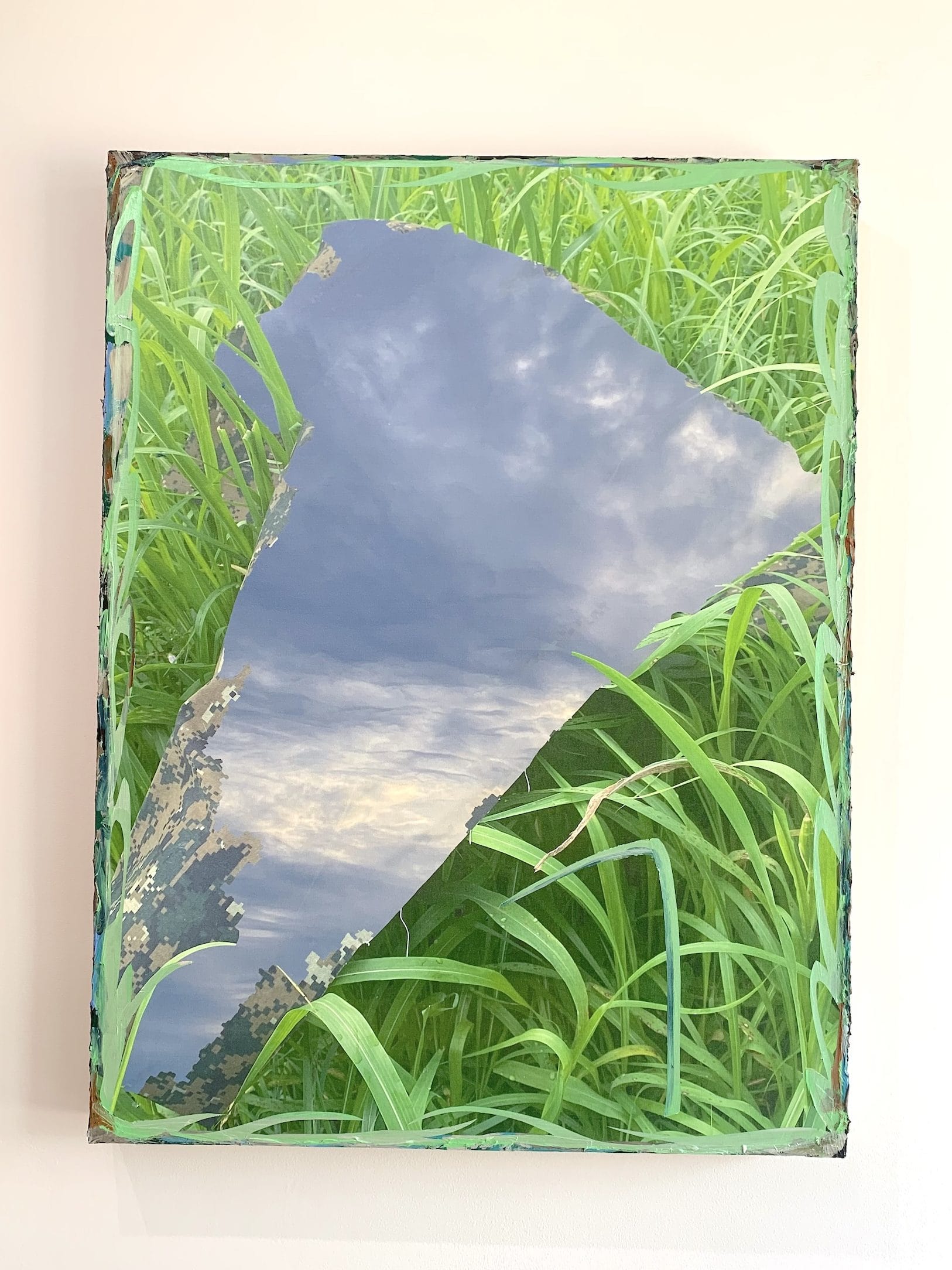 In the show’s titular work, a rough-edged triangle sits askew in a bed of tall green grasses. The digital image of a clouded sky fills the triangle, transforming it into a portal to another dimension, while a pixelated camouflage pattern at the bottom edge suggests an encroaching military presence — or, perhaps, the potential for digital images to become corrupted into unreadable grids of color.