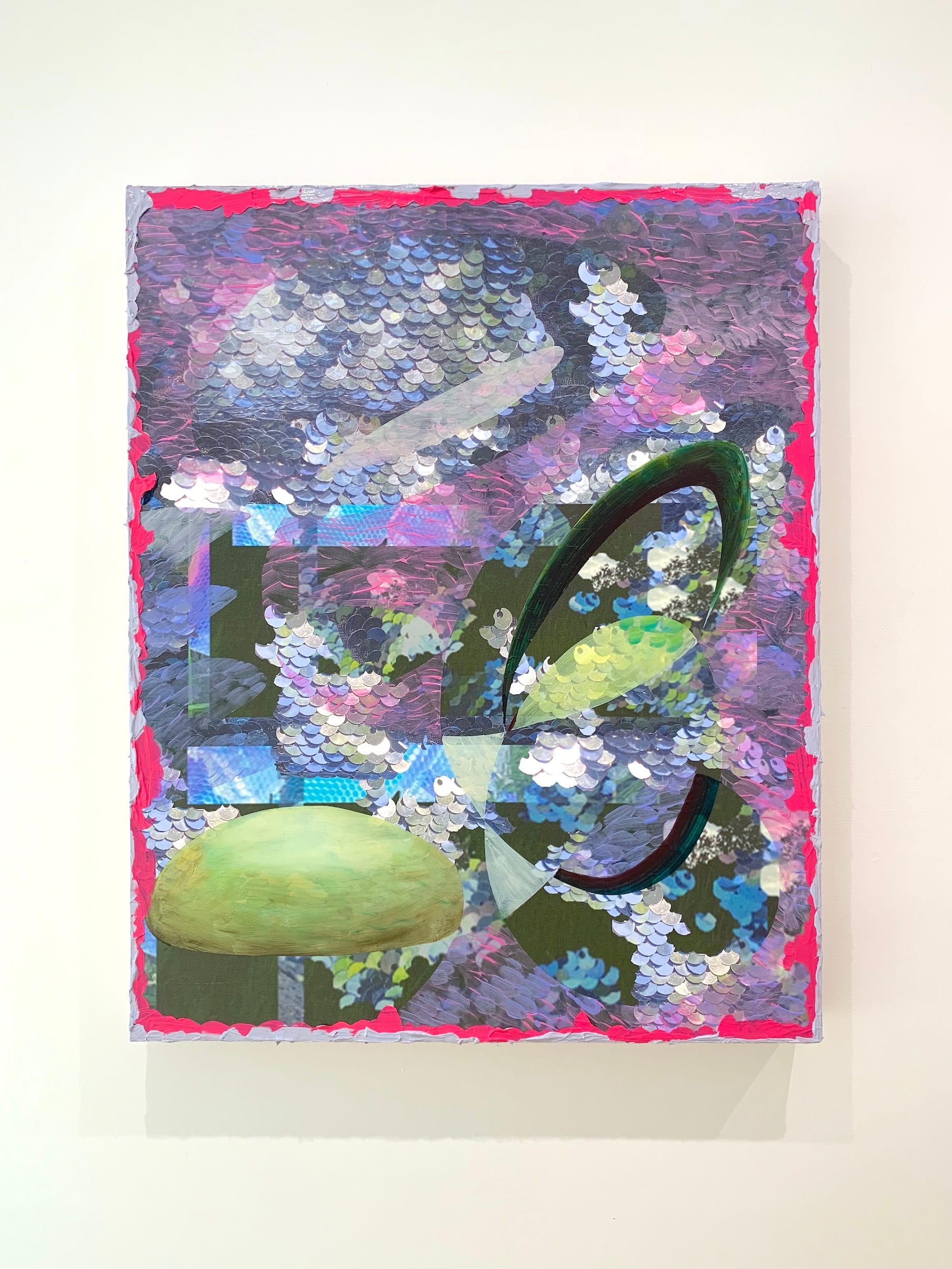 Bickel begins the works by digitally collaging her own photography, often selecting textural imagery, such as cloudscapes, grass, and trees, or sequined, mesh, and holographic fabrics. She reproduces the collages on canvas with an inkjet printer before mounting them on hardboard; she then intervenes with oil and acrylic paints, sometimes in thick globs and other times with an almost translucent lightness. Additional materials, such as hydraulic cement or holographic cellophane, amplify the work’s physicality or further confound the viewer’s visual perception.