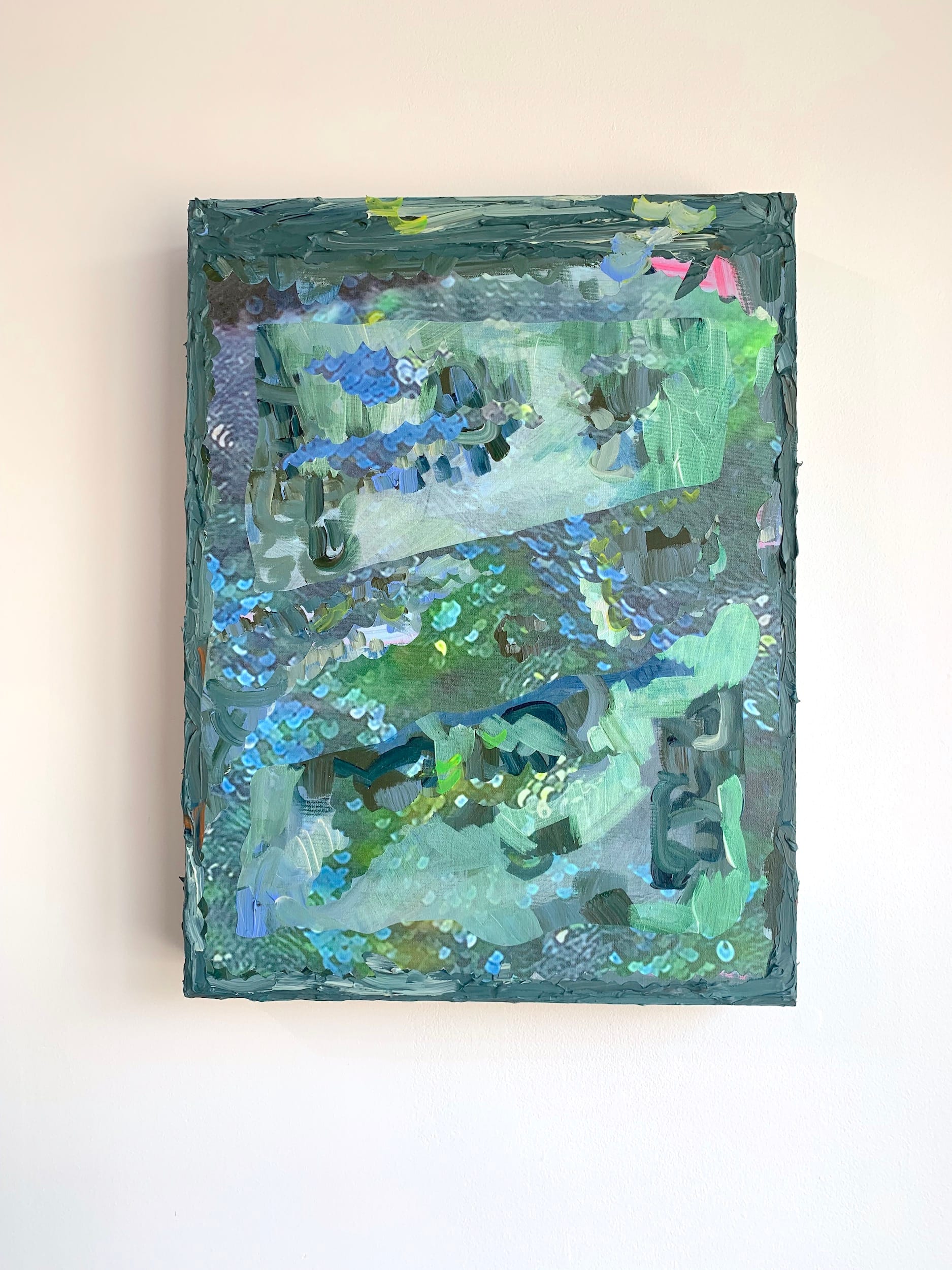 I share this information because I think knowing Bickel’s twin pursuits makes her work more readable, if not fully knowable. Knowledge, visual perception, and the disruption of both by new technologies are at the heart of the artist's current exhibition, Orgonon, at Institute 193. Together, her 12 recent paintings — all firmly ensconced in both the digital and the tactile — convey a vibrant and disquieting sense of what it feels like to be alive right now: to witness a flourishing of creativity amid war and environmental destruction and to sense an uneasiness with artificial intelligence even as we've come to depend on it in our daily lives and interactions.