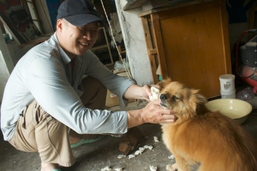 Where Ma Yida raises Pomeranians, painter Tang Jianying employs an enormous Tibetan Mastiff to guard his studio. Any visitor to Tang’s place is greeted first by the rattling of the barred door outside and the vicious barks of the Mastiff. Tang says the dog’s friendly once you get to know him, but I wasn’t too inclined to find out. The studio is a bigger space, a warehouse closer to “downtown” Song Zhuang complete with high ceilings, floodlights, and a pool table.