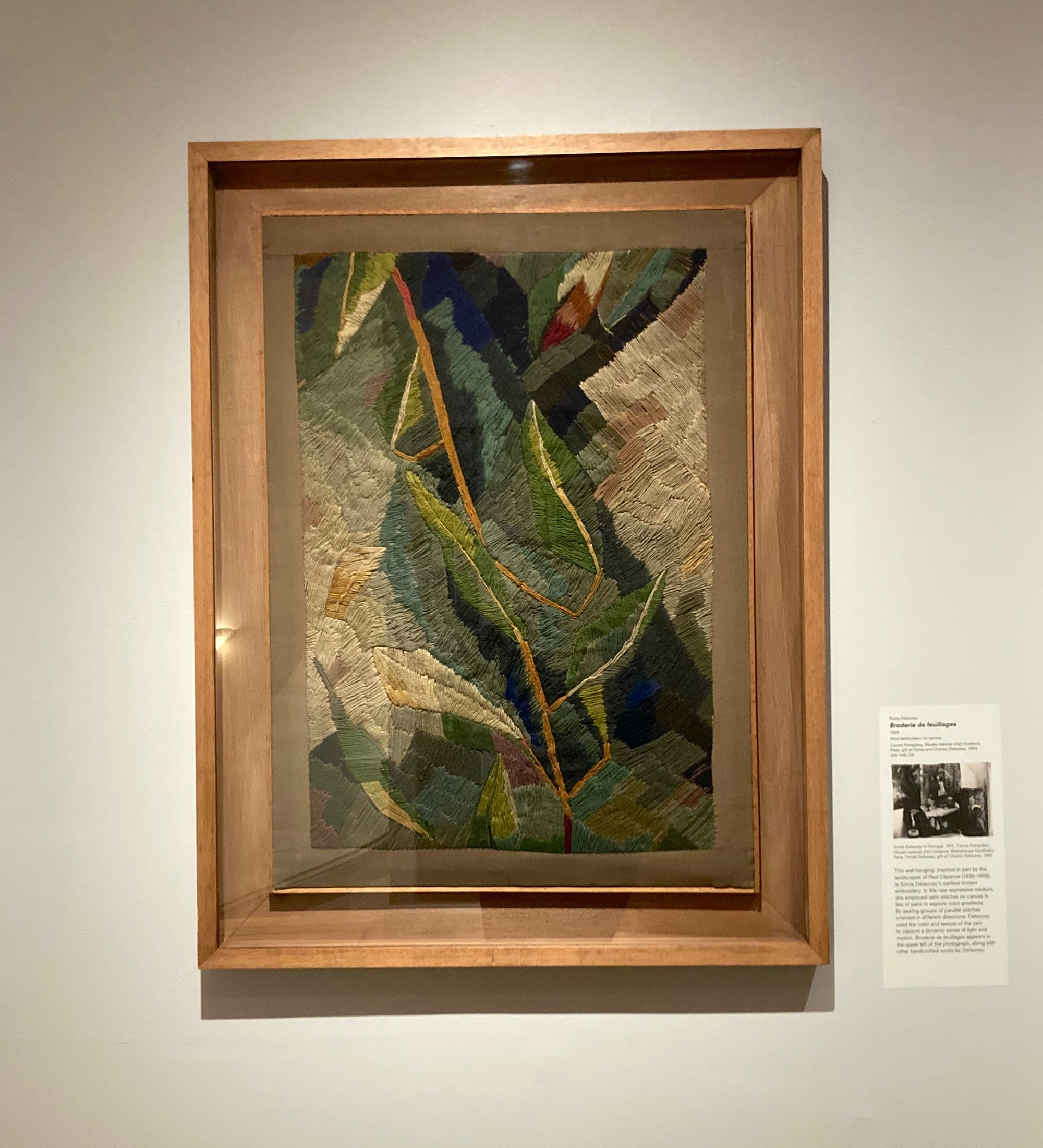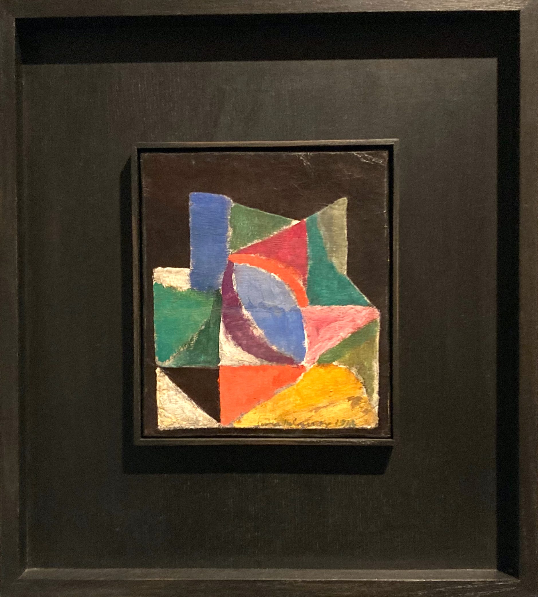 The exhibition explores the full range of Delaunay’s work, establishing the styles and motifs she used consistently and her collaborations and inspirations. Her early Simultaneist experiments crossed media: for example, a beautiful Cezanne-esque embroidery from 1909 shows her remarkable eye for color and pattern.