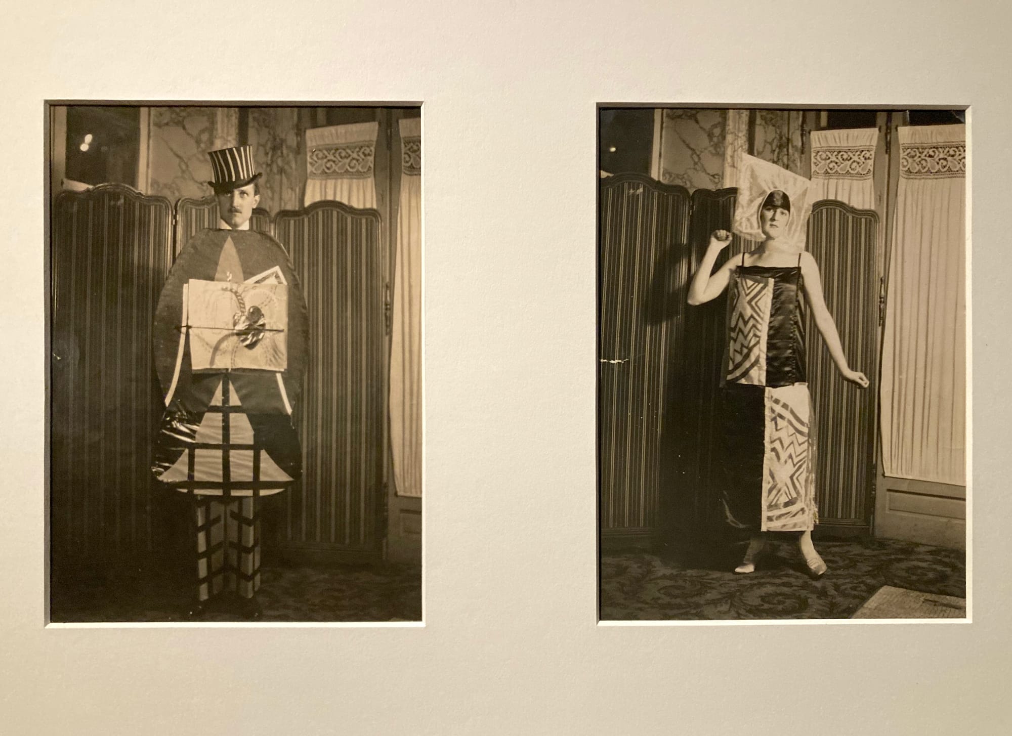 To the right of the Simultaneist section is a small room focused on her theater designs. It opens with a painting by Flora Lion of Lubov Tchernicheva as Cleopatra, wearing a costume Delaunay designed; the painting is flanked by two large black and white photographs of Tchernicheva. It’s useful to see the realization of Delaunay’s design to get a sense of how the shapes and gestures of her drawing were translated into actual clothing — and Lion’s painting is an effective representation of the more traditionally figurative art world from which Delaunay’s work stood apart. Juxtaposing Delaunay’s ballet costumes with the weird and experimental pieces she made for Tristan Tzara and other Dada artists reveals how coherent yet flexible her design style was, how she was able to adapt her distinctive use of color and shape to add texture to any given circumstance. These costume sketches bridge what could be oversimplified as her design and artistic practices, though she clearly did not see them as separate.