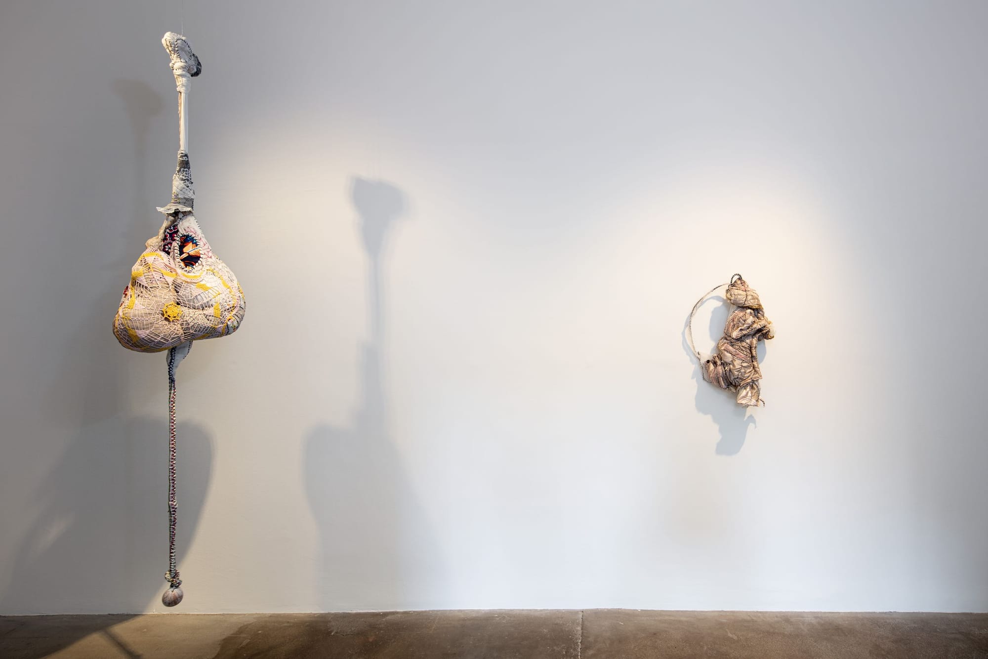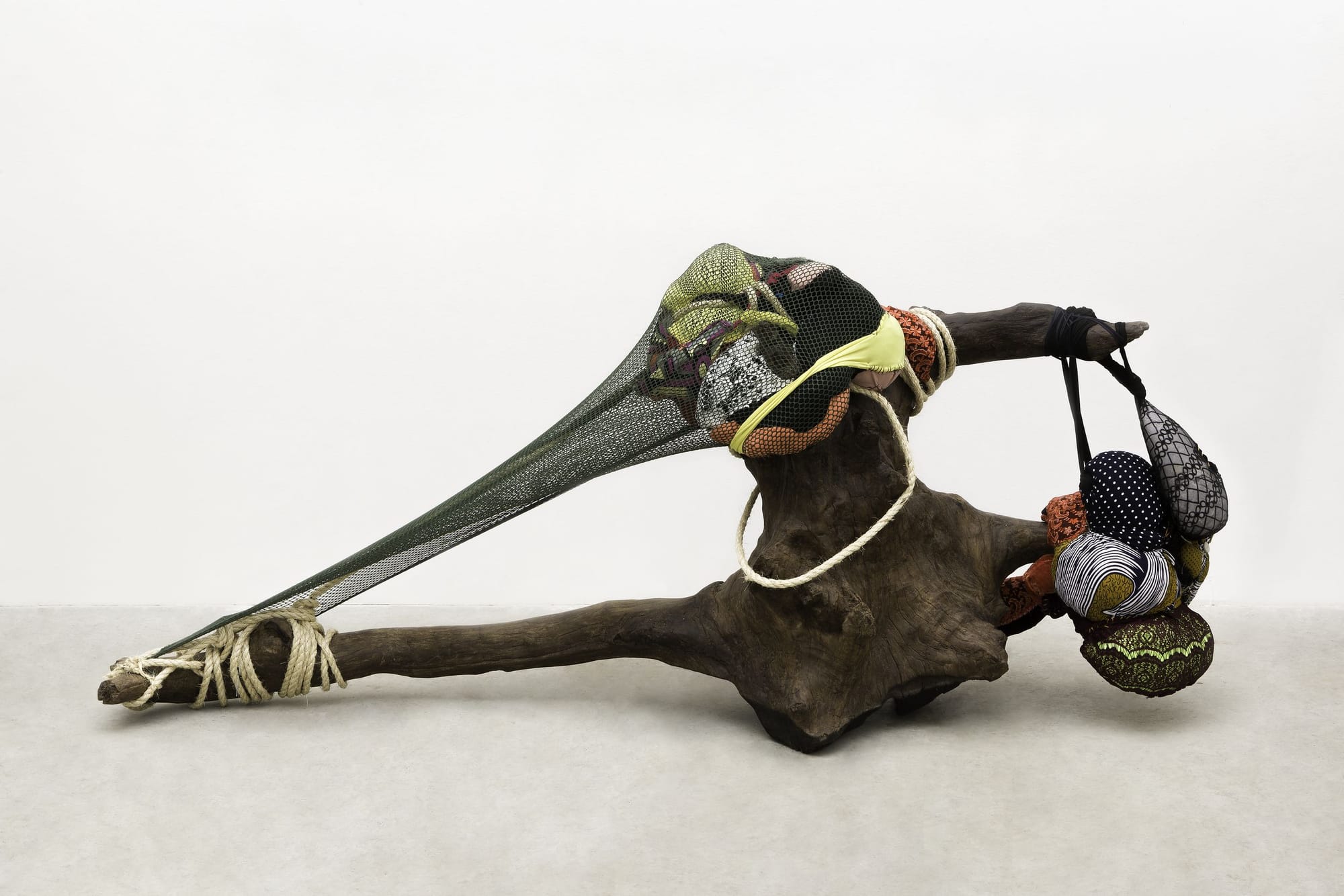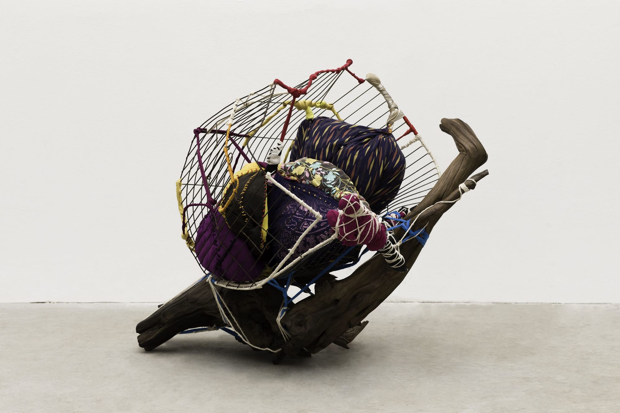 Gomes finds objects at thrift stores and receives clothing with sentimental value as gifts. These objects are imbued with the traces of lives lived in them. Yet the colonial dissemination of labor and industrialism are subtly reflected in her work, which relies on the textiles fabricated within its very system. There is, thus, an underlying violence in Gomes’s colorful sculptures, in the silent entanglement of labor and commerce — a ghost of the textiles’ producers and wearers. In “Cordão dos Mentecaptos” (2016), a tied rope that hangs in a whimsical fashion takes on the form of an umbilical cord, an outstretching vine, or a lynching rope dragged across the floor. It projects fruit-like shapes onto the wall, which are upheld by a shape that reveals itself as a noose The artist tacitly inserts bodies with her swollen sculptures; her stitched wires and strings could be cages or limbs, but these bodies boycott complacency or inertia.