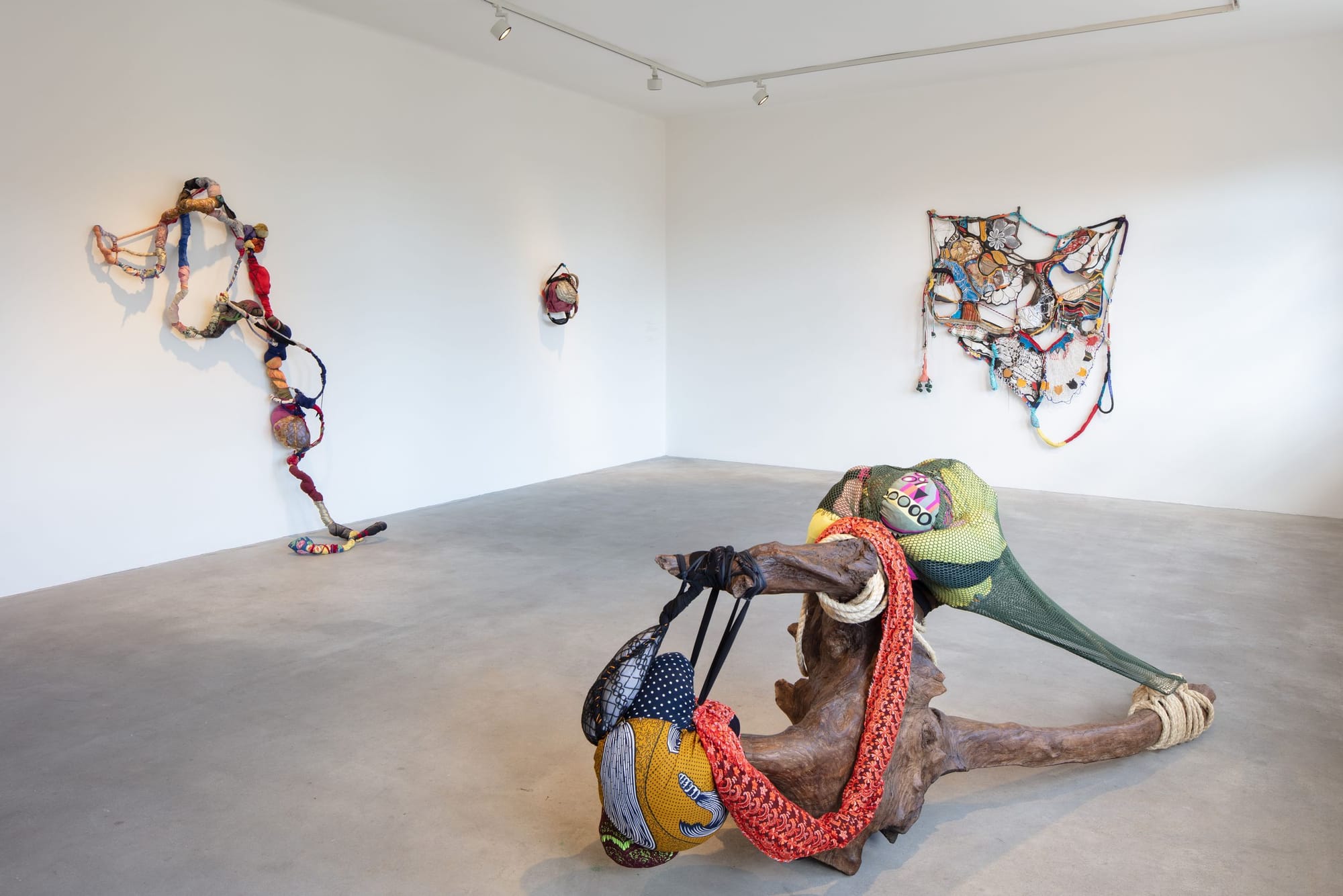 “Visible and mobile, my body is a thing among things,” wrote French philosopher Maurice Merleau-Ponty in his 1964 essay “Eye and Mind.” “Because it moves itself and sees, it holds things in a circle around itself.” Gomes’s organ-like organisms are bodies among bodies that serve also as self-portraits through the artist’s use of found and gifted materials. The act of pulling these materials apart and stitching them into a new form — of sewing and tying and retying and twisting and tying again — creates a tangible bridge between the past and the present.