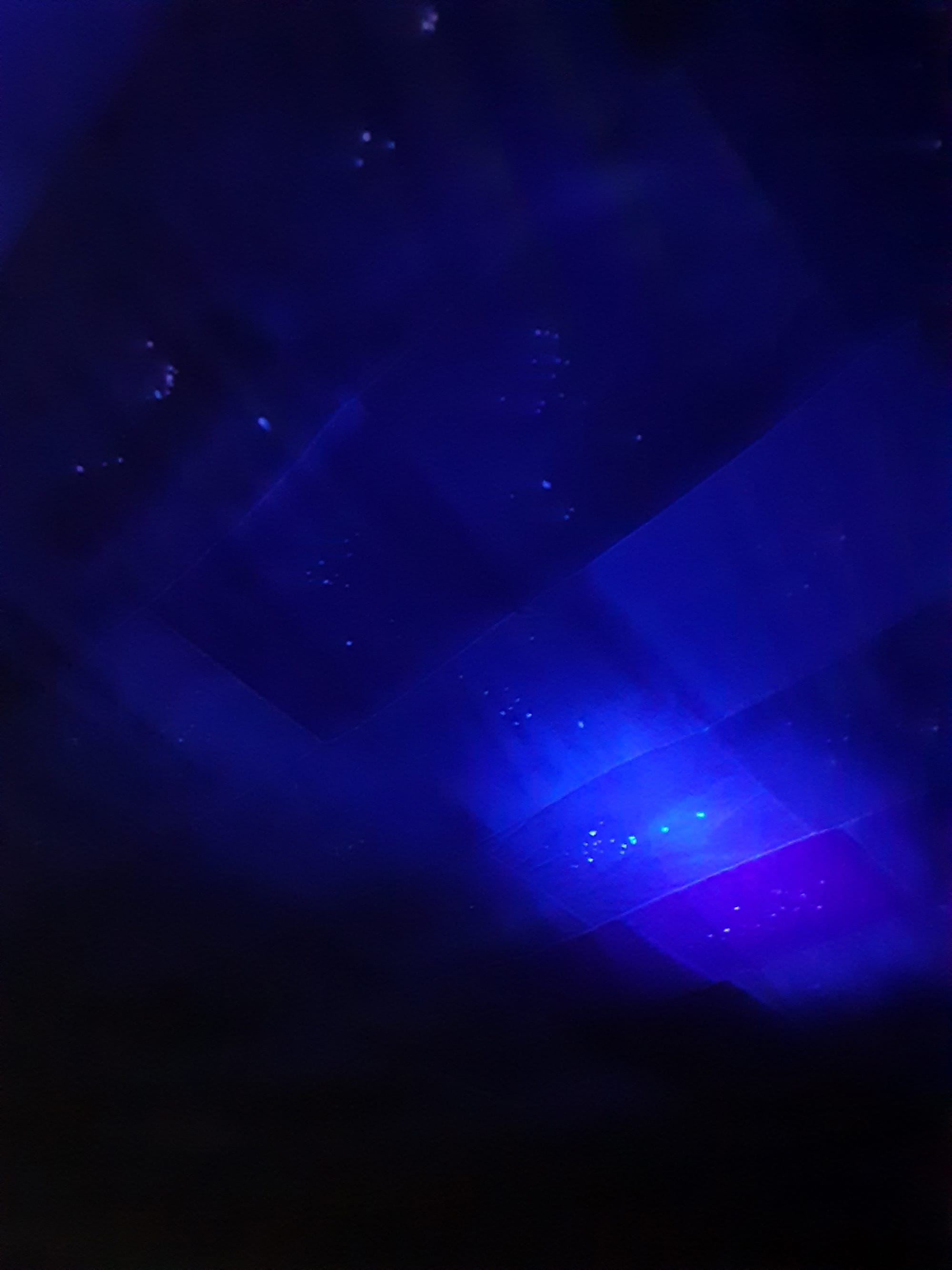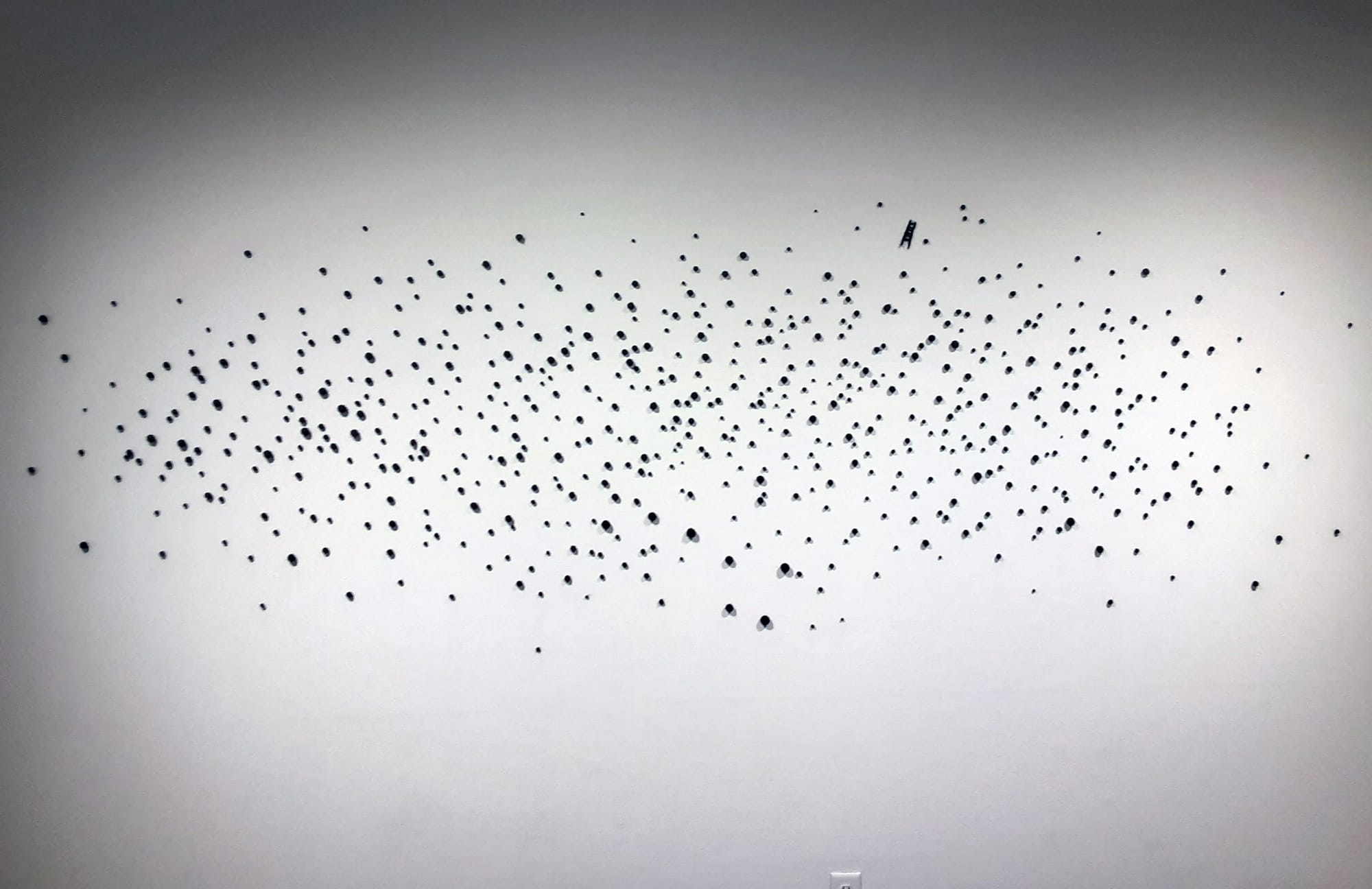 The installations across the two institutions engage in a dynamic conversation, reflecting a collaborative curatorial effort. If whiteness is the theme of “Monumental Cloth” at HCCC, intense colors and textures are the theme of “The Beaded Prayer Project” at HMAAC. In contrast to the constellation of the artist’s hair on a white wall in “Constellations” (2022) at the former, “Finding Freedom” at the latter consists of clusters of black light reacting on blue cloth in a darkened room. Across both spaces, Clark’s work toggles between violence and affirmation to weave together a shared experience of reflection and resilience.