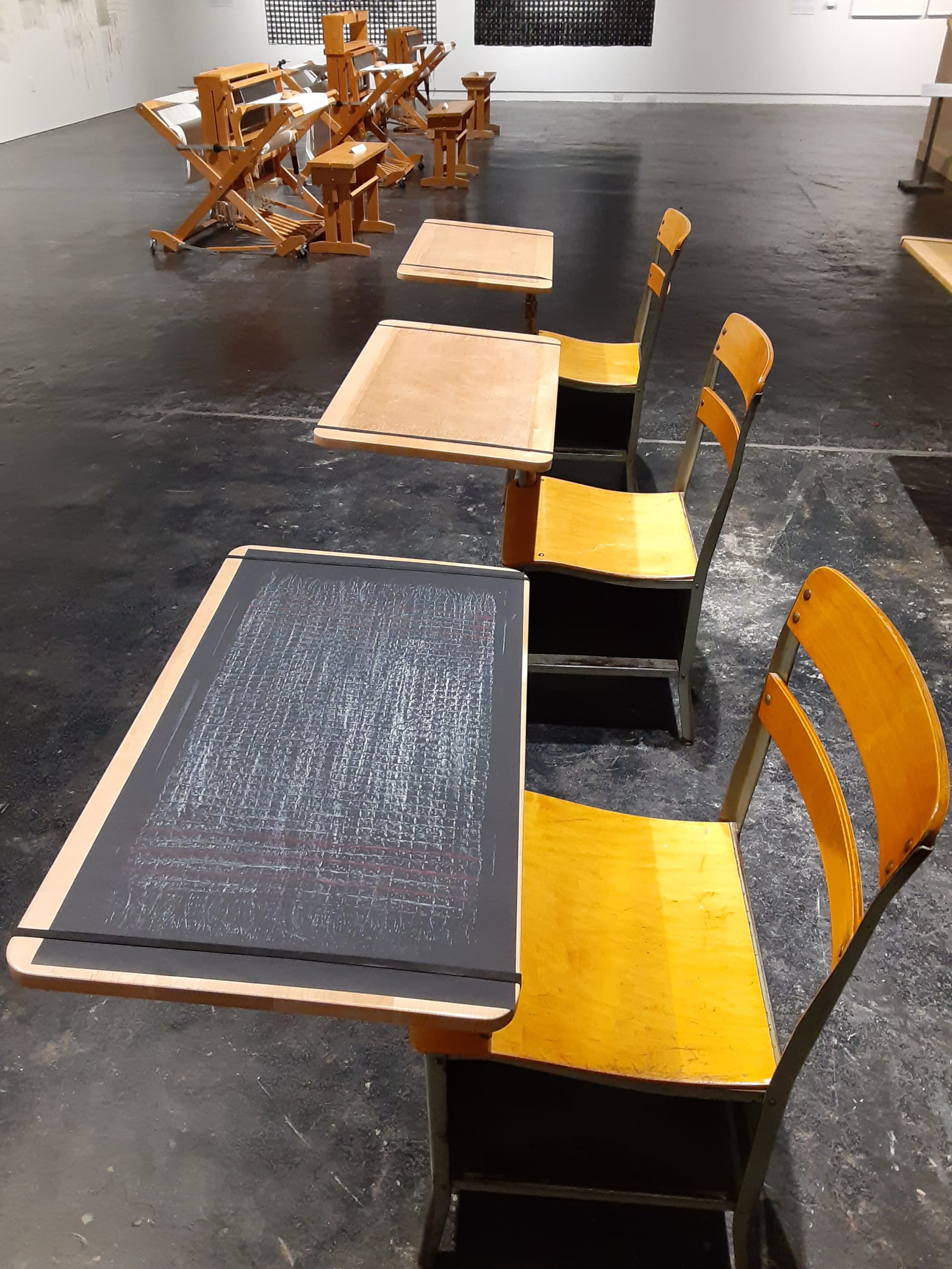 Clark’s Monumental Cloth (2019) series is hauntingly visceral in the whiteness of its participatory materials, including textiles, crayons, and threads. The series represents the dismantling of the ideology behind the hateful Confederate rebel flag in favor of the peace and surrender represented by the Confederate flag of truce. Whether through the white crayon on black paper in “Lesson Plan (Confederate Truce Flag)” (2019), or the white threads that visitors weave on the loom in “Reconstruction Exercise” (2019–ongoing), these distinct approaches to realizing the truce flag suggest that surrender can be an intentional act of relinquishing power structures rooted in White supremacy.