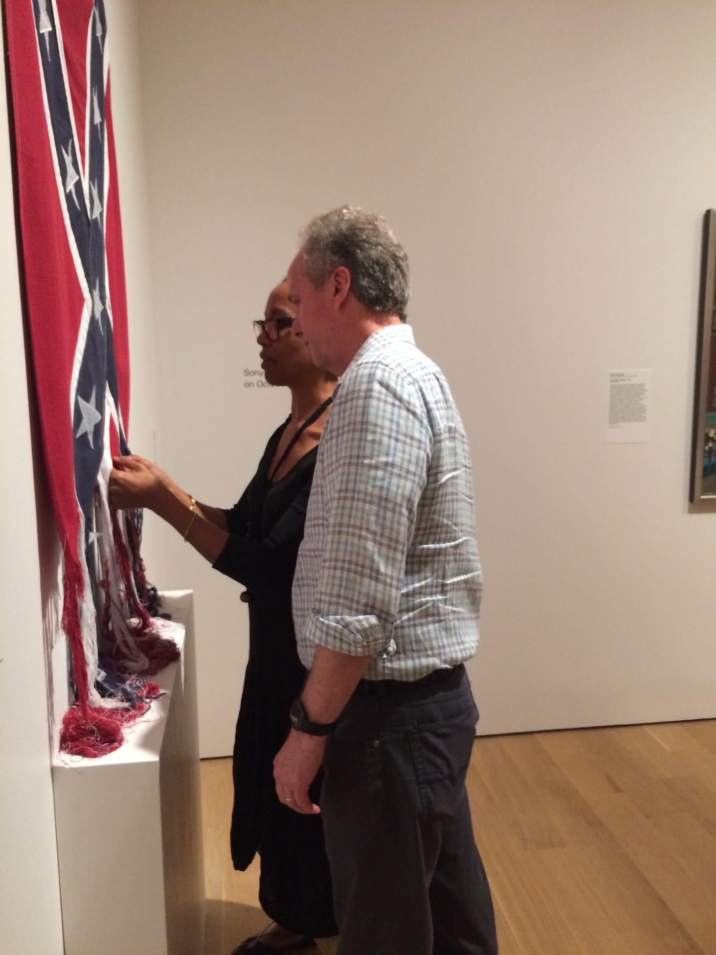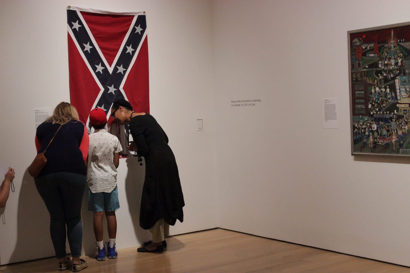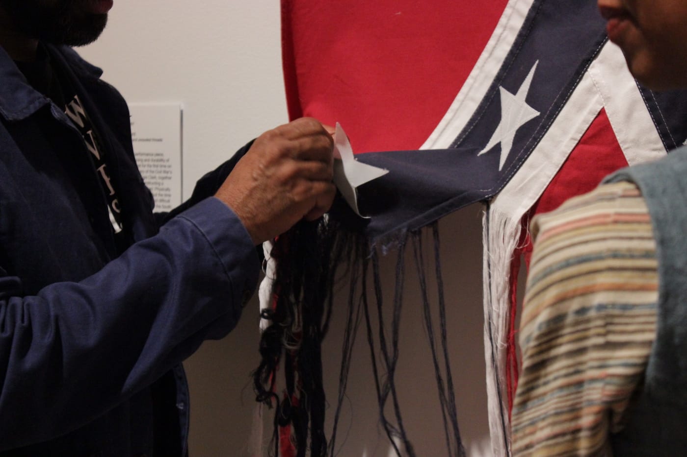 LOUISVILLE, Ky. – Last Saturday was not the first time Sonya Clark has deconstructed a Confederate Flag. She has performed Unraveling twice before: first, in June 2015 at the now-defunct Mixed Greens gallery in New York City and then at the Nasher Museum of Art at Duke University, in October 2016. Yet even though this gesture has been enacted twice before — once within the context of the same exhibition, Southern Accent: Seeking the American South in Contemporary Art — the performance of Unraveling at the Speed Museum on October 14 clearly holds a new significance; this was the first performance under the current presidential administration and since the country has found itself embroiled in debate over the presence and ramifications of Confederate imagery in the wake of the violence in Charlottesville, Virginia, this past summer.