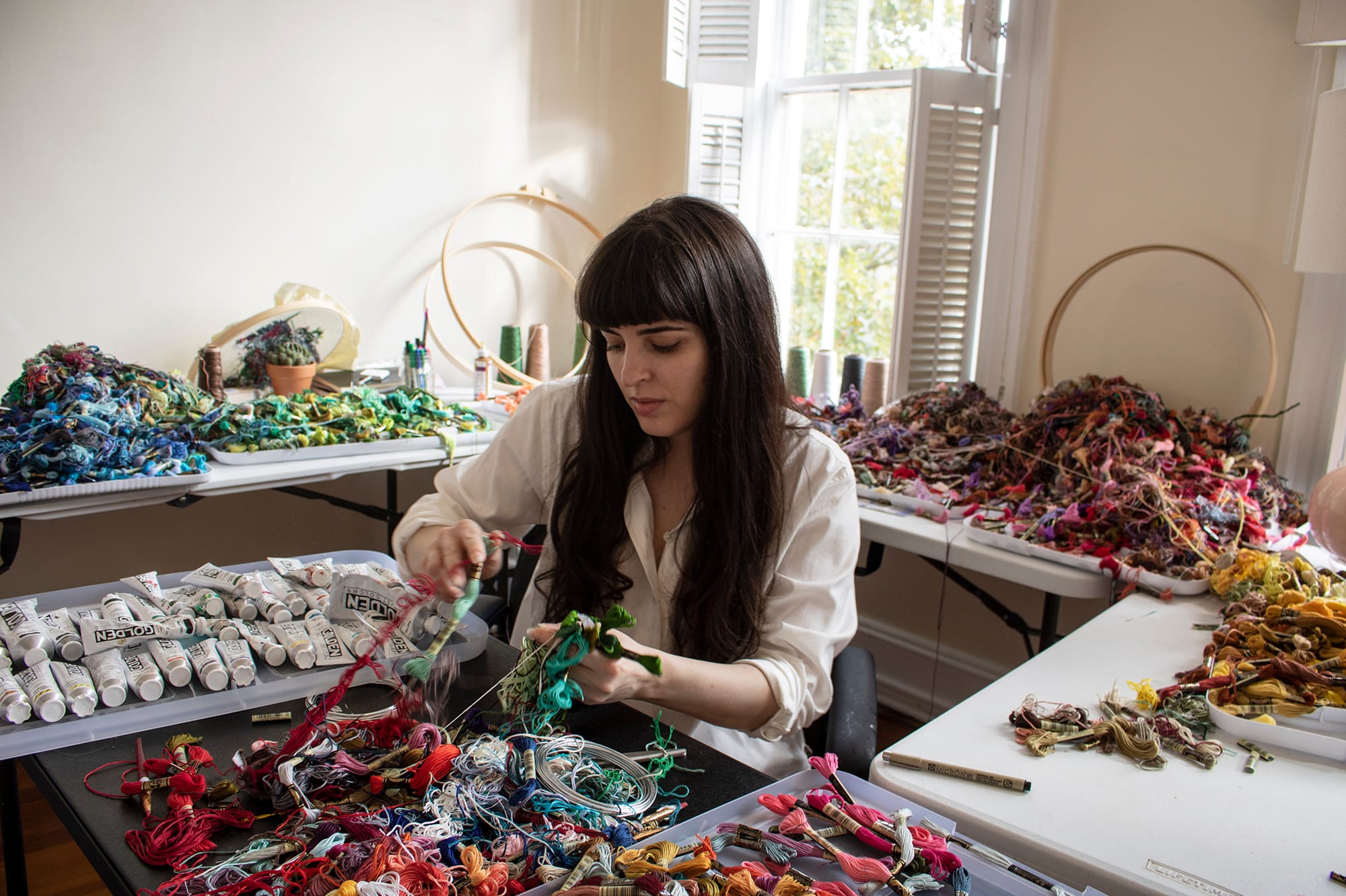Narrett sees parallel play as more than a girlhood phenomenon: “I’m interested in the idea that in taking on a fictive role, you may be experimenting with what you truly want to be…[By] architecting this space of play, you can reach some sort of truth within yourself or with the other person.” But she stops short of the notion that use of once-gendered materials is a social or political act in itself today: “I wouldn’t say that my using thread is not a feminist statement or is just a material…[But] I came to embroidery very serendipitously. I didn’t go out to engage in those materials consciously.” It was only months after working with needle and thread that Narrett learned about her medium’s feminist history, and how women artists “really paved the way for craft material to be in the art world.”