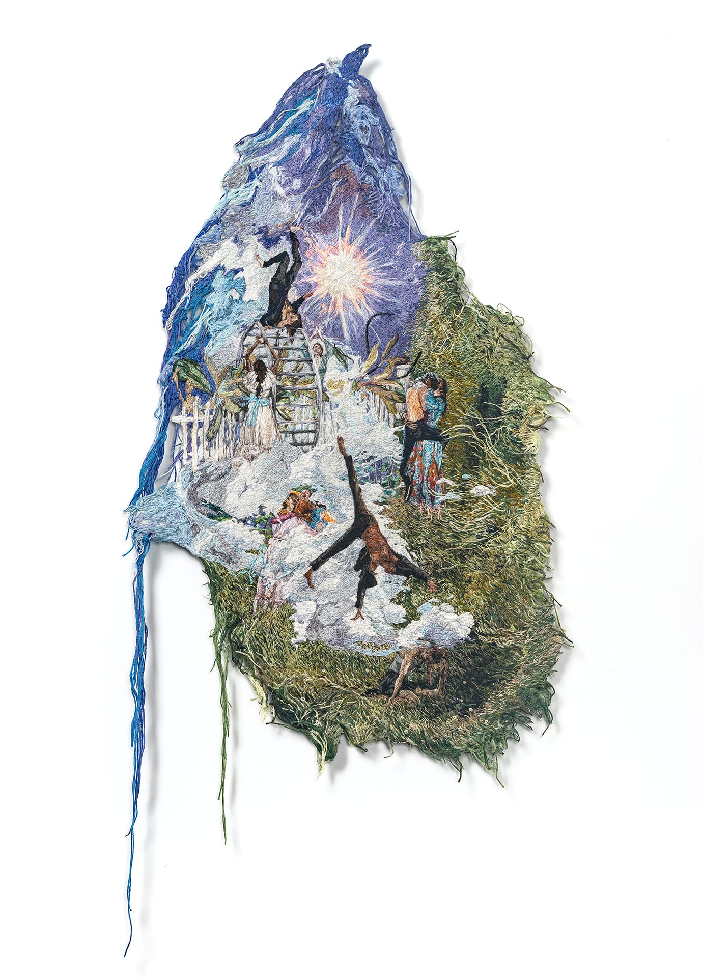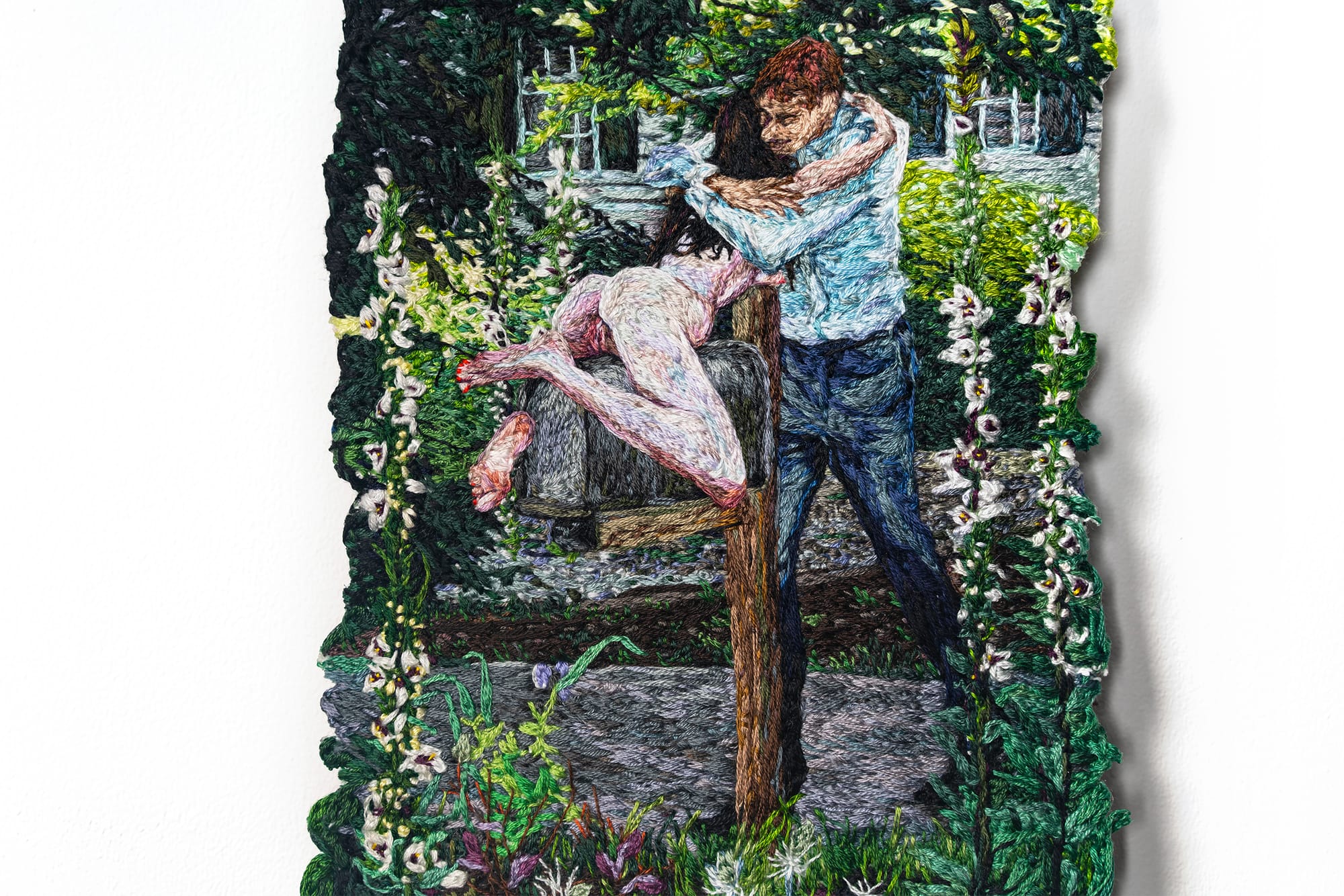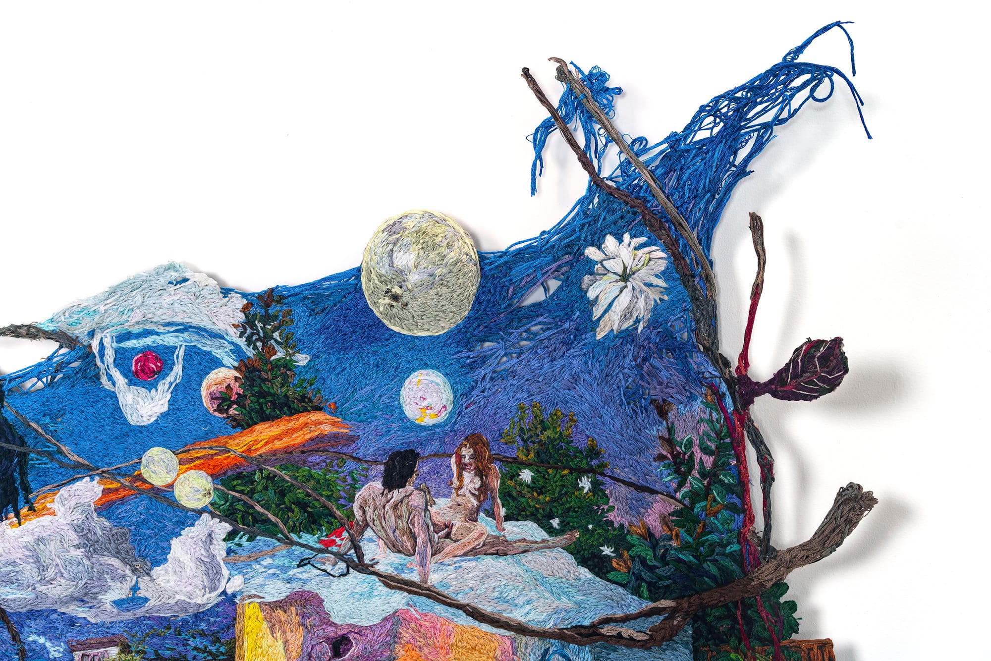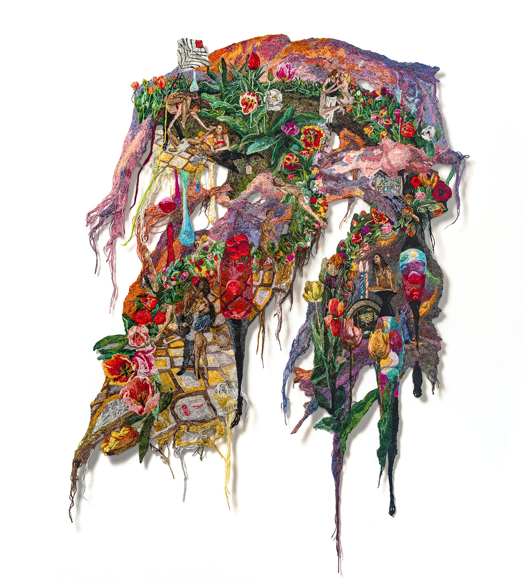 Sophia Narrett was a painter before she began “drawing with thread,” as she told Hyperallergic. Dense with figurative detail, her embroidered bas-reliefs weave together not only fabrics but also various daydream-like narrative threads.