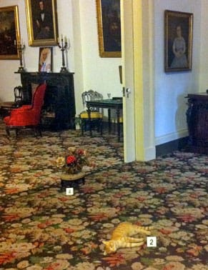 Throughout the museum’s dozen or so rooms, Calle has placed 45 objects and collections of seemingly random items — a taxidermied cat, a wedding dress, piles of books and correspondence, a typewriter, etc. — amongst the period art and domestic accoutrements which continue to share the space. Each of Calle’s objects is marked by a numbered placard, which in turn is keyed to an explanatory wall text. The story behind that stuffed cat (#2), for example, reads: