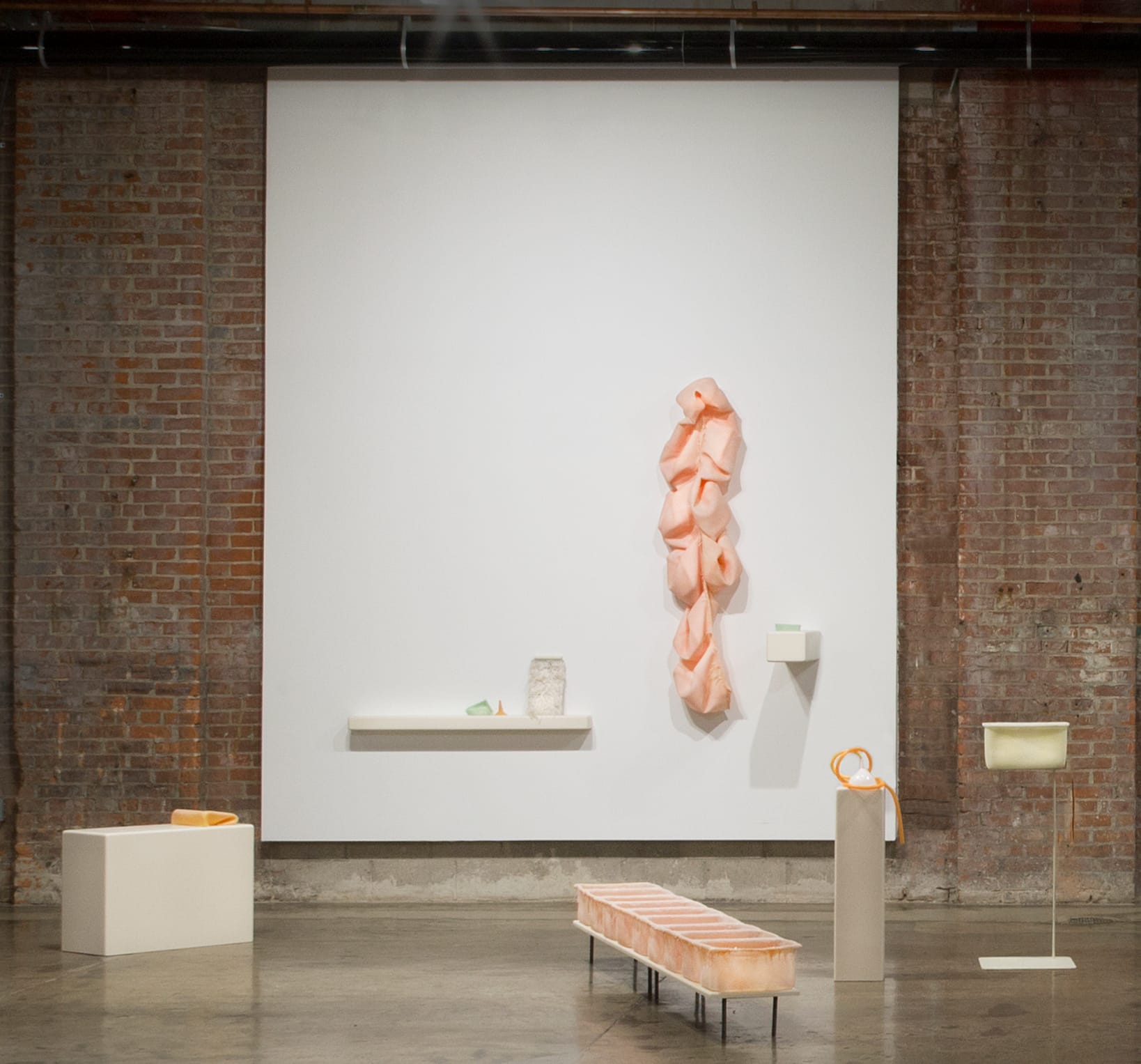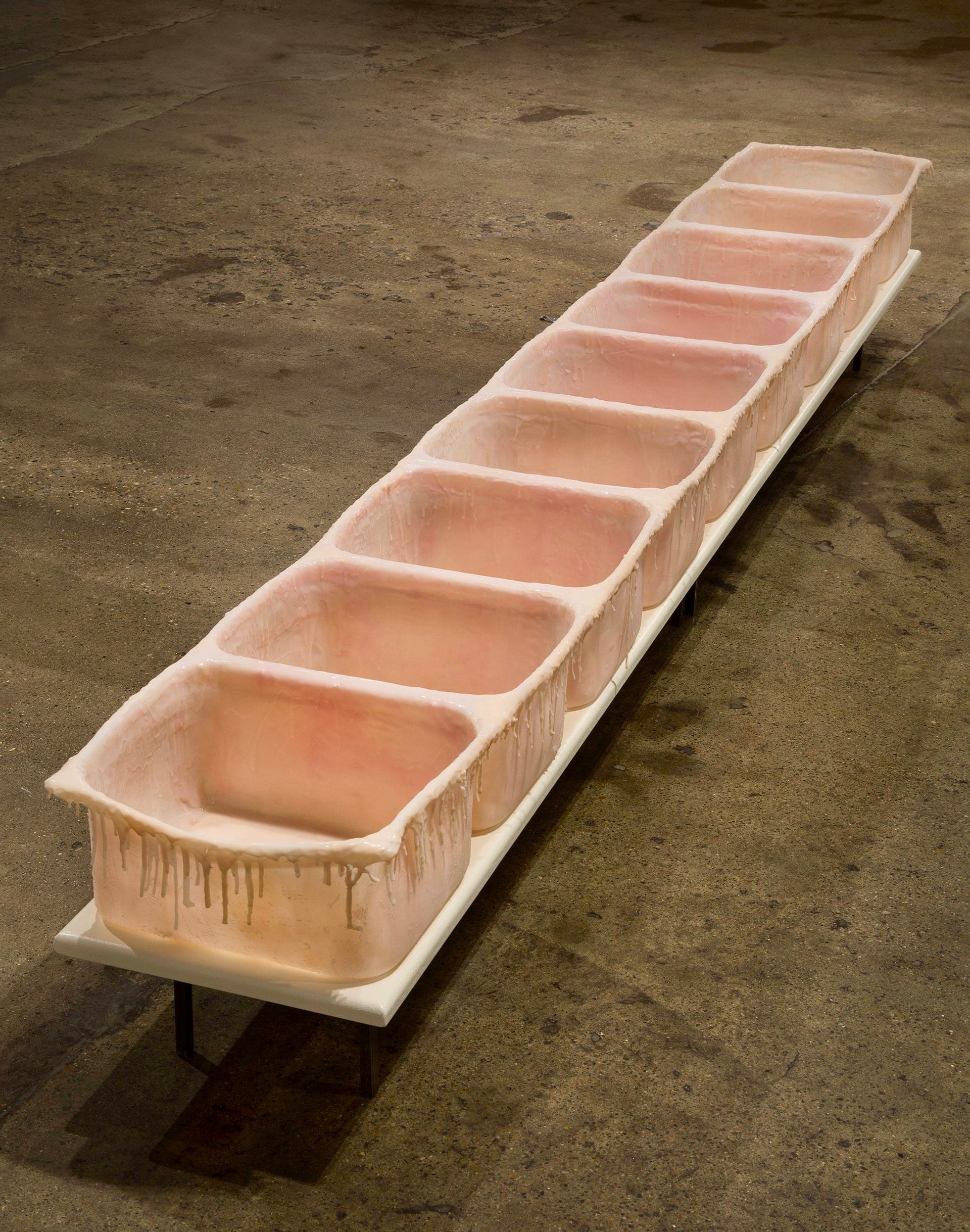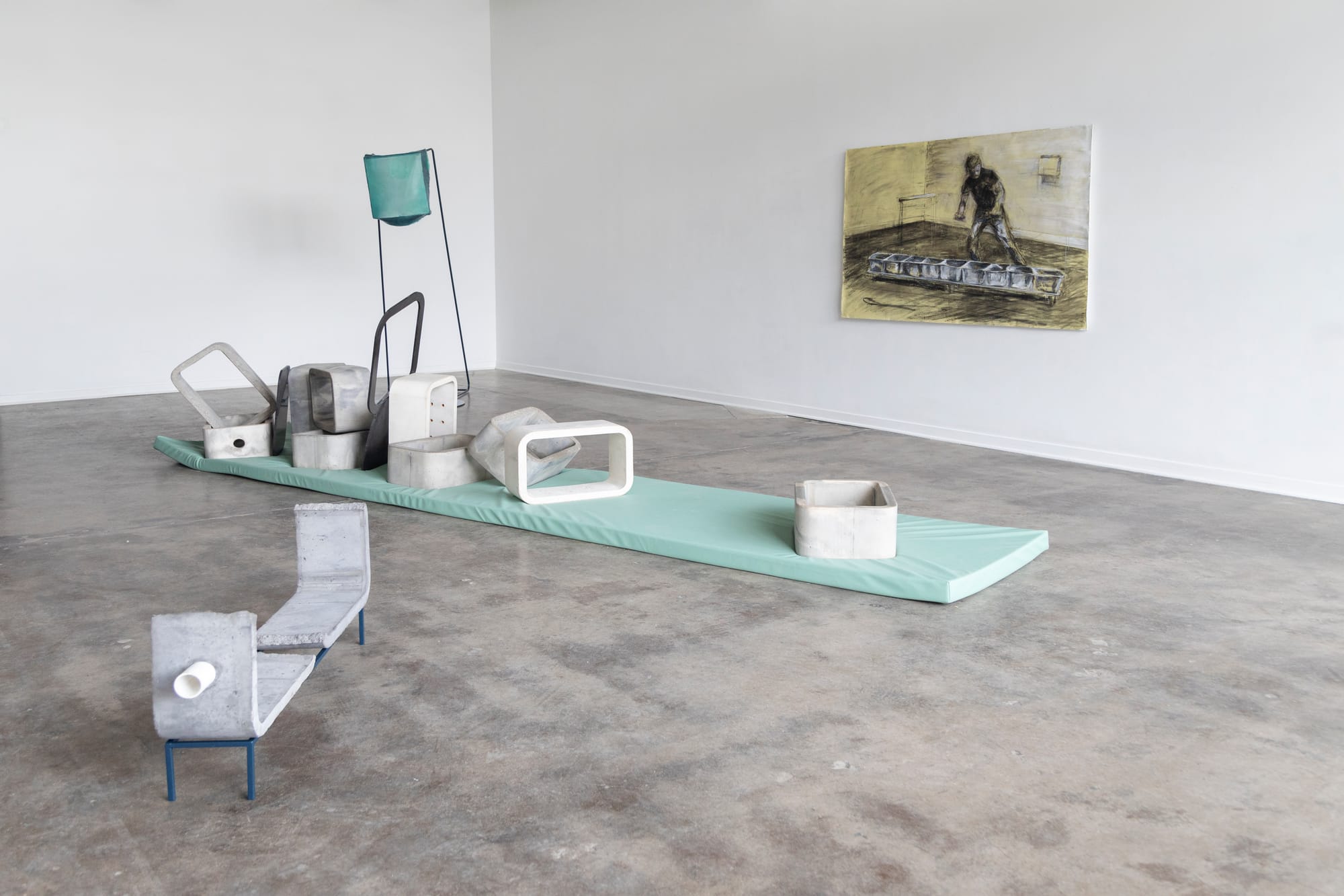 This statement applies broadly to many of Eisner’s subsequent works, including the ironically named "Absolute Truth" (2019) at Simone DeSousa Gallery in Detroit, which further explores silicon poured to create a series of interconnected tubs that at once emulate the newborn ward of a hospital, a row of sinks, or troughs of food at a soup kitchen. Eisner also pours concrete into shapes that roughly emulate the torso of stand-mounted phone booths, a shape that Eisner affectionately calls “roundy rectangles.”