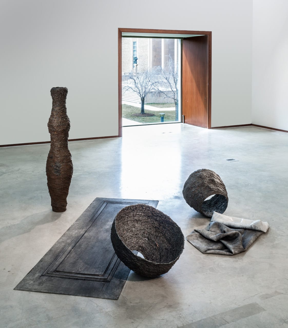 These welded forms also appear in her 2015 Cranbrook thesis, "This Definitely Happened," (2015) which employs them as scar-riddled proxies in an abstract composition with the impression of a charred door and an undefined, sooty sheet of foldable silicon. The variable tableau seeks, in part, to unpack the emotional reality of a series of two house fires in the Berkshires that Eisner and her family experienced when she was three and five years old.