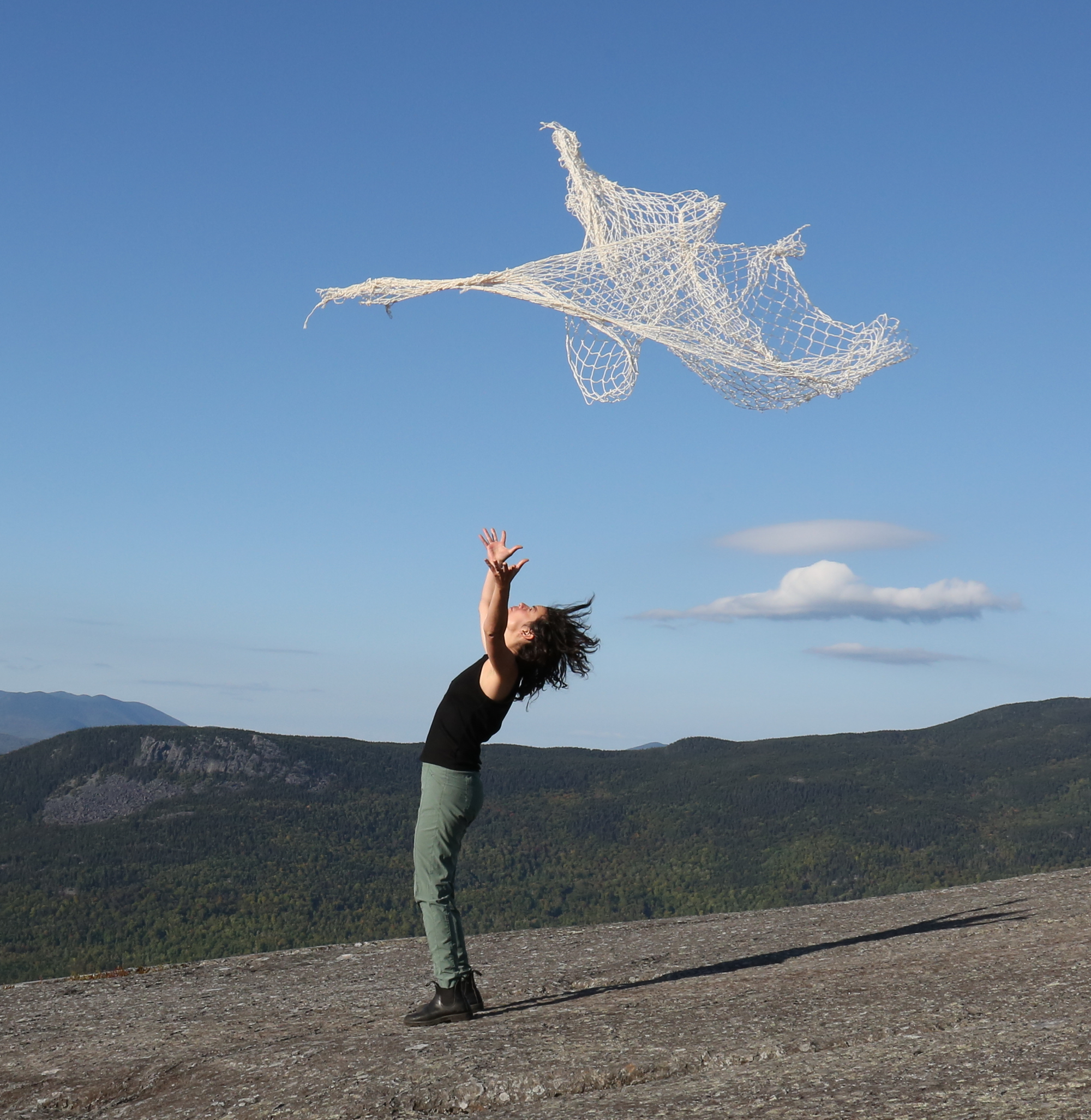 A recent photo series captures images of artist Beatrize Escobar in a performance in the Hundred Mile Wilderness region in Maine’s Piscataquis County, throwing nets made by Eisner with a set of self-made tools into the air. Literally and figuratively, Eisner casts a wide net.