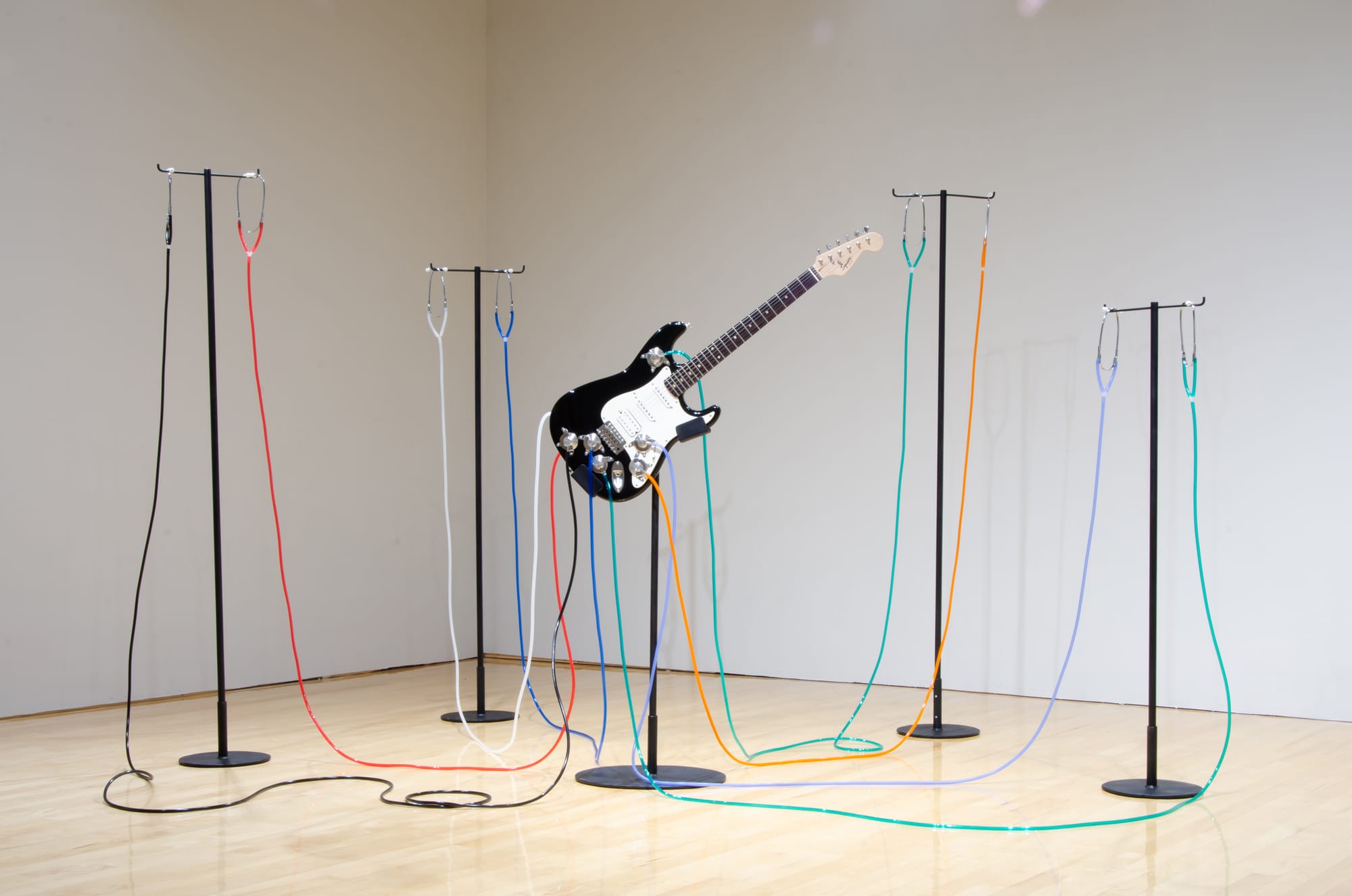 Most recently, Eisner employed an electric guitar readymade as the centerpiece of a new work encompassing ideas about the shared experience in isolation that is related, but not limited to, the COVID-19 pandemic. Rather than porting into a speaker to amplify the sound, music played on the guitar can only be heard in a circle of “listening stations,” created by stethoscope-like headphones that jack directly into the instrument.