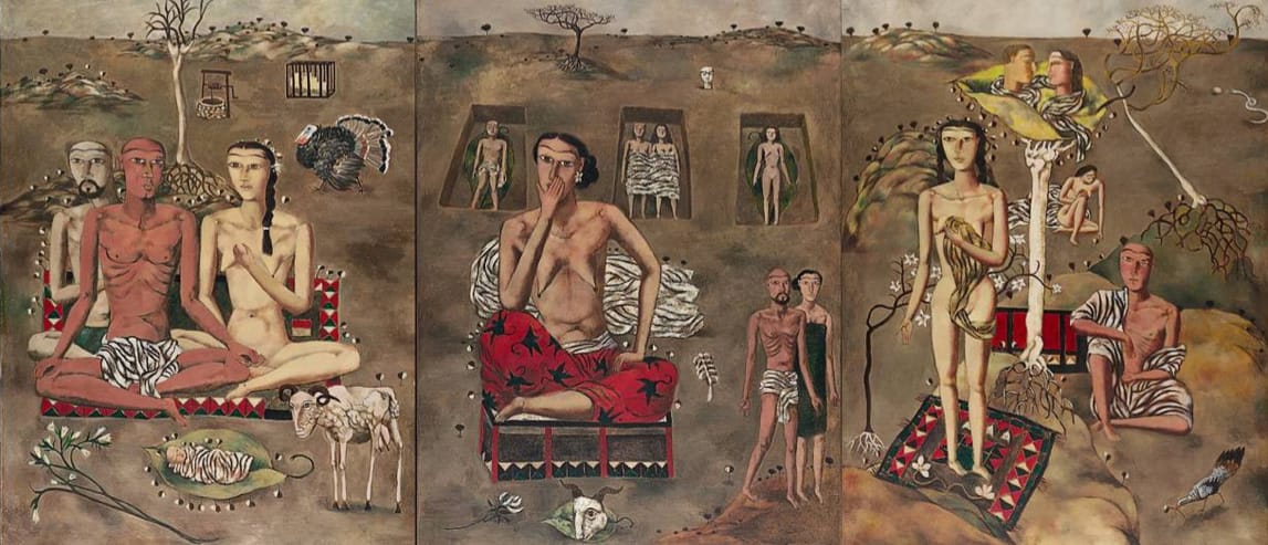 In the Sotheby’s sale, it’s possible to see these artists experimenting and pushing boundaries in a vital way that’s missing in their more recent work. Most viewers won’t connect the Zhang Xiaogang masterwork included in the Ullens sale, “Forever Lasting Love (Triptych)” (1989) (seen above), to the artist’s popular “Bloodlines” series, which is dominated by brushy, ethereal faces appropriated from revolution-era family photos. The earlier work is powerful in its own right though, a surreal narrative sequence part Frida Kahlo and part Max Beckmann.