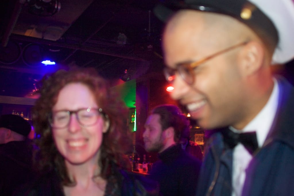Straight from the merch table, I ran into Animal New York blogger extraordinaire Marina Galperina chatting with Punch-Me Panda Nate Hill, of Wall Street Journal and WNYC fame, who was not panda-suited but did have on a fetching milk man outfit that made him a good crowd landmark. The bands had started playing before we even arrived to the party, but with everyone shouting over the music it was a little unclear which musicians were which, and which sounds were the Sound of Art and which were not. It’s cool, I’m looking forward to spinning the record by itself soon and hearing the tracks on their own, un-remixed.