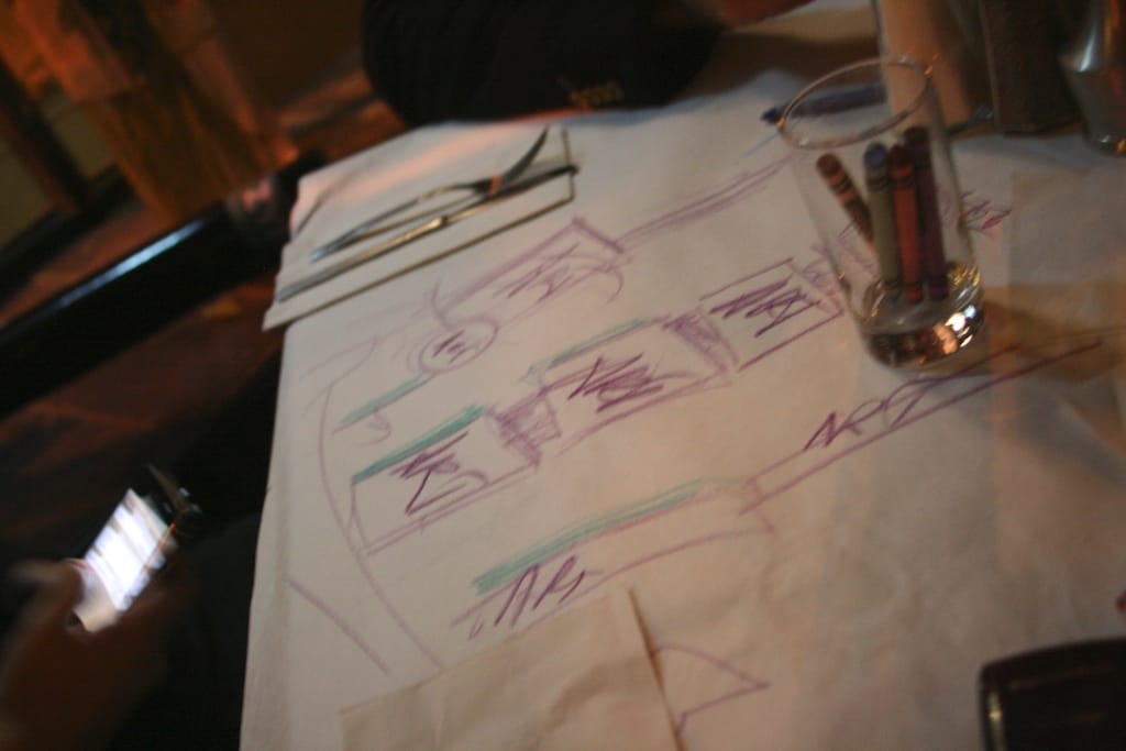 What happened after that is slightly blurrier. The crowd grew continuously, I talked to Joanne McNeil and finally connected her with wunderkammer Tomorrow Museum in my blogosphere-noob brain. I saw Judith Braun from Work of Art weaving in and out of the crowd. I listened to more bands, which provided an excellent, often glitchy, noise-based backdrop to the club’s dungeon vibe, and drank more with the rest of the millers by the bar. Martin Hoorweg and Justus Bruns of Times Square to Art Square were hanging out too and as several of the people I knew started to trickle out, I accompanied them to a nearby restaurant. True to their project, Justus sketched out a lovely rendering of what Times Square might look like covered in Art, on the table cloth. Thankfully, it was just in crayon.