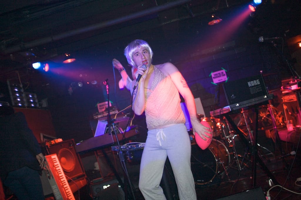 After another set change, comedian and host Julian Stockdale (seen at top) took the stage in a fabulous sparkly tank top and a wig he could be seen preening over earlier in the evening. Awesomely backed by a sole button-pusher, record-spinner and laptop-tapping musician who I assume was Mikey IQ Jones, Stockdale extolled the virtues of the Sound of Art, Paddy, Paddy’s mom (who was also in attendance), and the party in general. He flashed us before he left the stage, too. After the MCing was over, the bands got back to playing and I got back to people watching and listening to the self-destruction of the periodically functioning fog machine.
