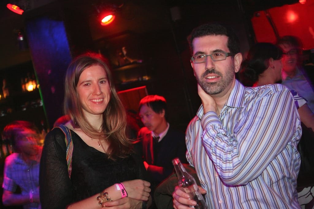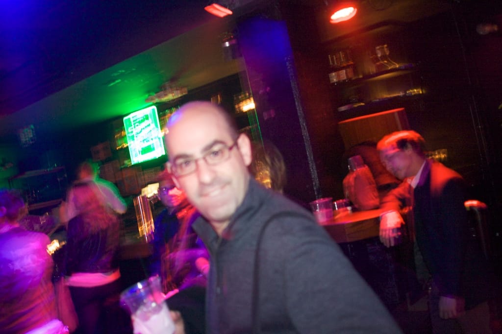 After hanging out around #TheSocialGraph and kicking the evening off with a music-themed YouTube retrospective from Brent Burket, Brent, Hrag and I met up with our esteemed publisher Veken Gueyikian and set off for Manhattan from the wilds of outer Bushwood. A detour through the Lower East Side’s Cortlandt Alley, a now-buffed shortcut that until recently was covered with street art, put us right at the door of Santos, where a conscientious bouncer asked us if we were here for “the art fags.” Clearly, we were.