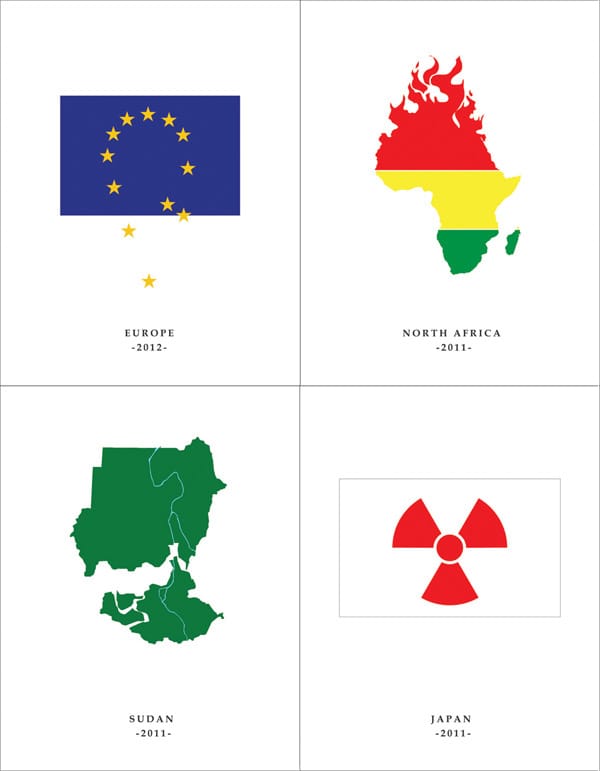 If some of his editions are centered on American events — like painting the White House black to commemorate the 2008 US Presidential election or New Orleans’ characteristic fleur-de-lis half-submerged in water as a commentary on Hurricane Katrina — the others look at events in Sudan, Japan, North Africa and Europe.