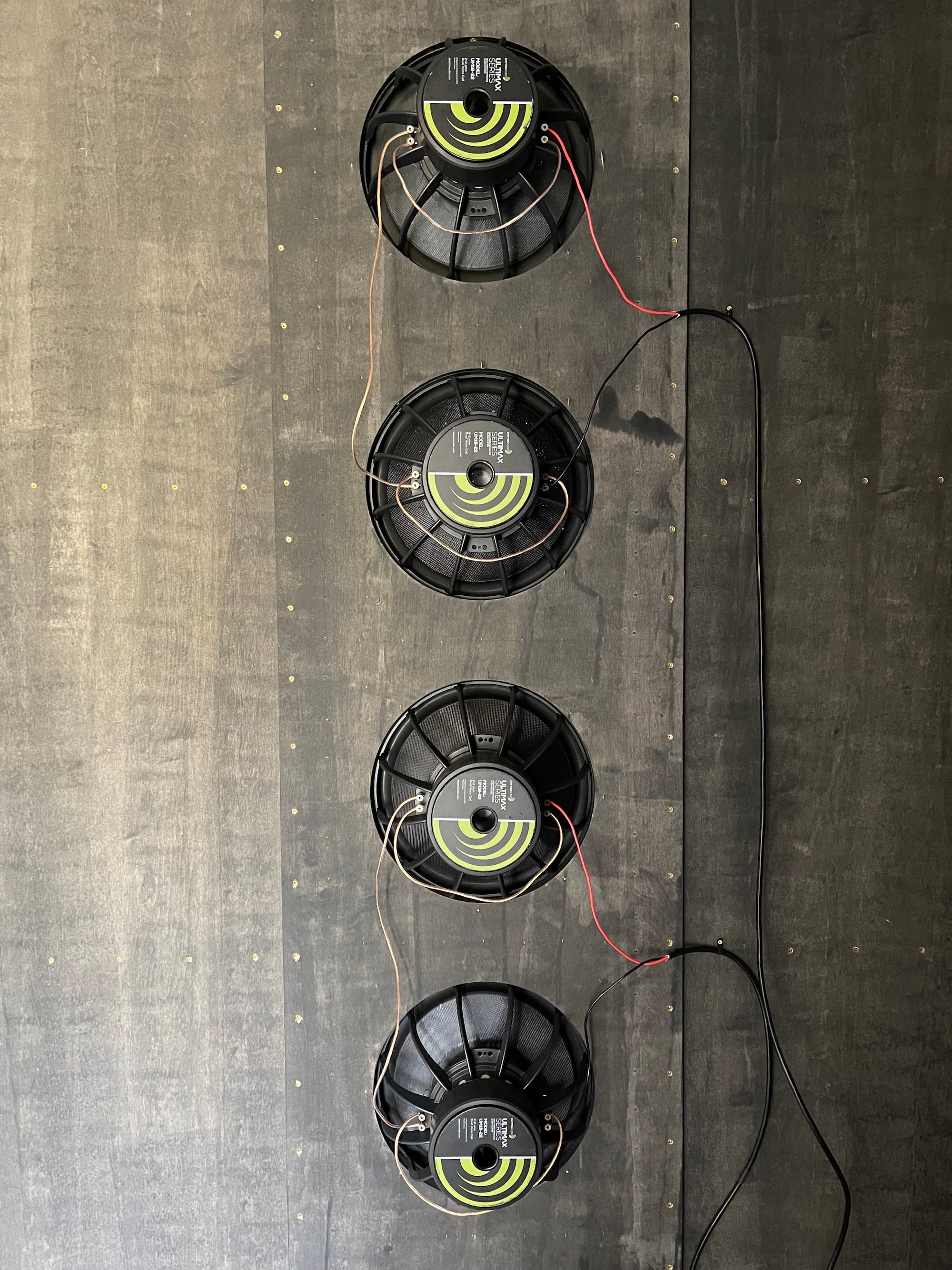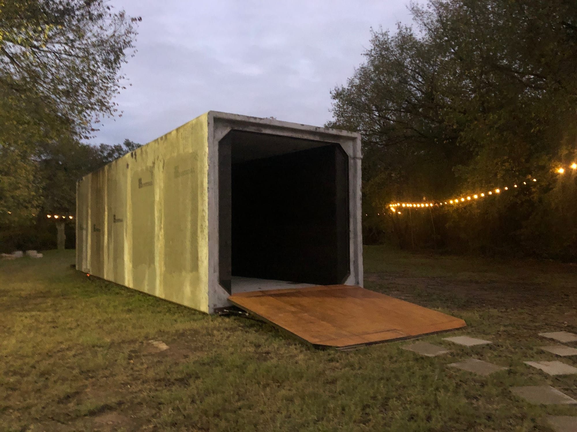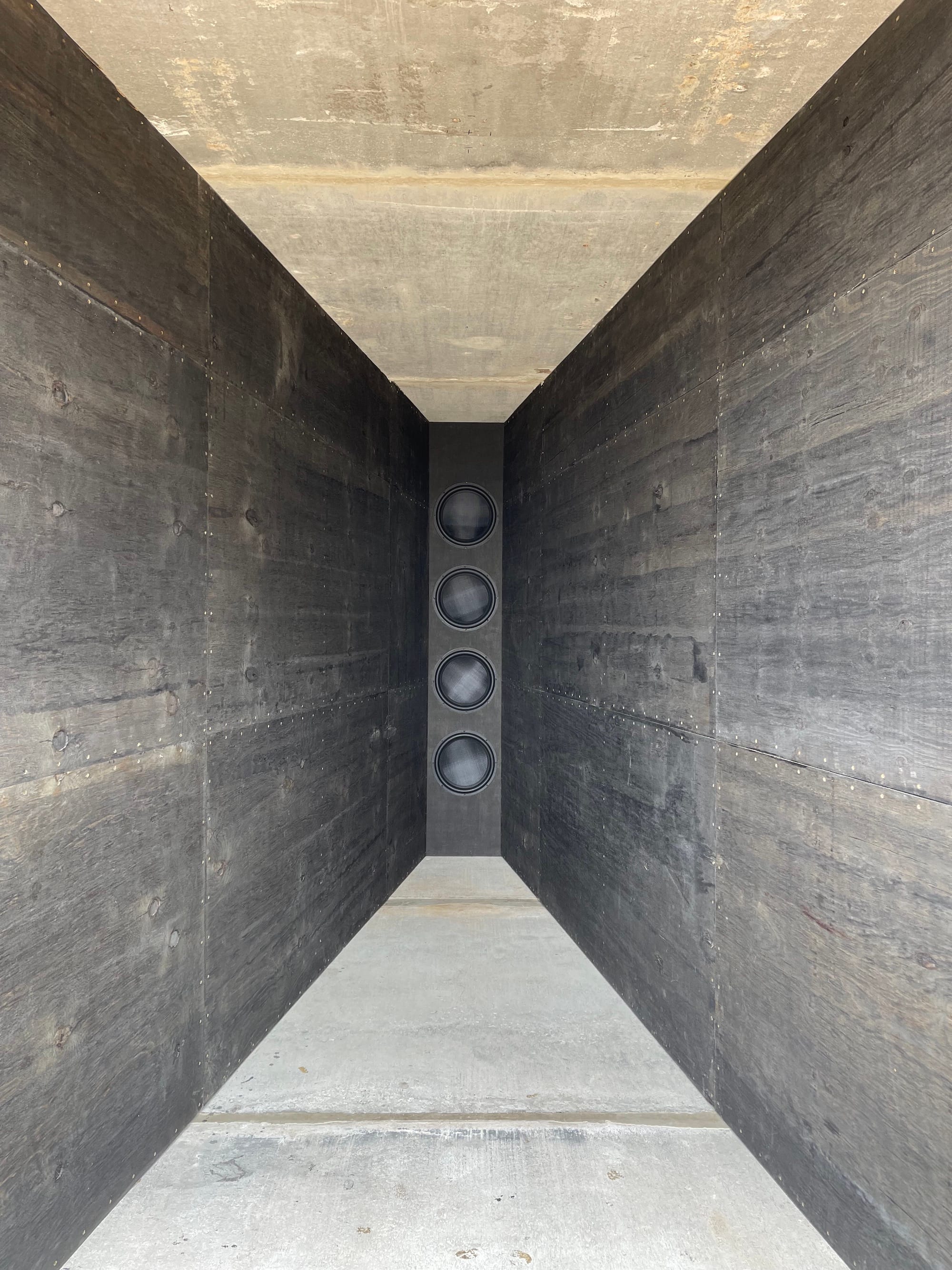 Comprised of five concrete culverts donated by the nonprofit gallery’s neighbors, a concrete manufacturer named Forterra, Co-Lab's unique architectural structure is particularly suited to Peters’s exhibition. Its unfinished concrete “floors” and “walls” speak directly to the type of industrial manufacturing the artist’s field recordings reference, and its tunnel-like shape can easily be converted into a gigantic speaker, which is exactly what Peters did with the space.
