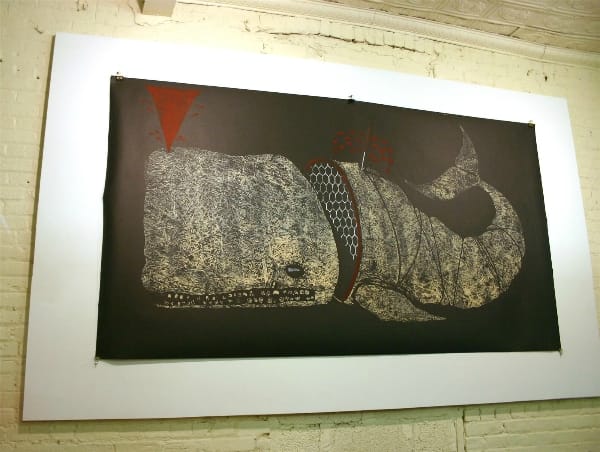 Back onto Bushwick Avenue, I met Chuck Tisa — beer in hand — sitting on his stoop at 791 Bushwick Ave. Tisa, along with his wife Rachel Phillips and friend Janice Sloan runs The Parlour out of their Victorian townhouse. A real hybrid apartment-gallery the space offers perhaps one of the most unique opportunities for art viewing I have ever experienced. The three gallery owners have embraced the challenge and hang the work “we think is cool” directly onto the wood paneled, white plastered walls, replete with original period detail. Nearly baroque in its opulence, sculptures made from Nike sneakers by Sean Paul Gallegos are the perfect old world-meets new school complement to the ethos of the space. Tisa and Phillips are both artists, and I was thankful for a chance to check out Phillips paintings in her studio upstairs. Her off balance, exaggerated figures are elusive and inviting in turn.
