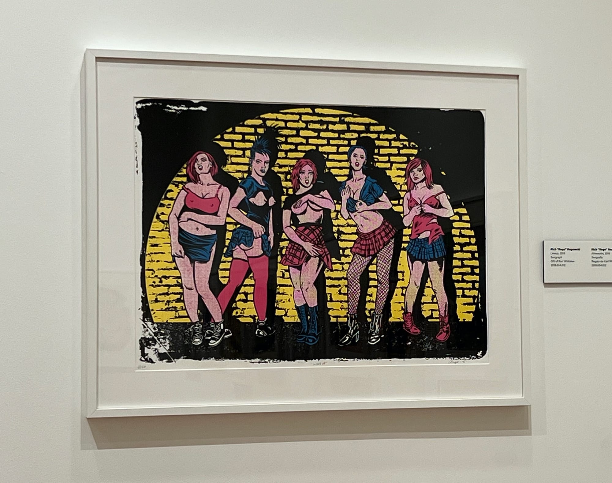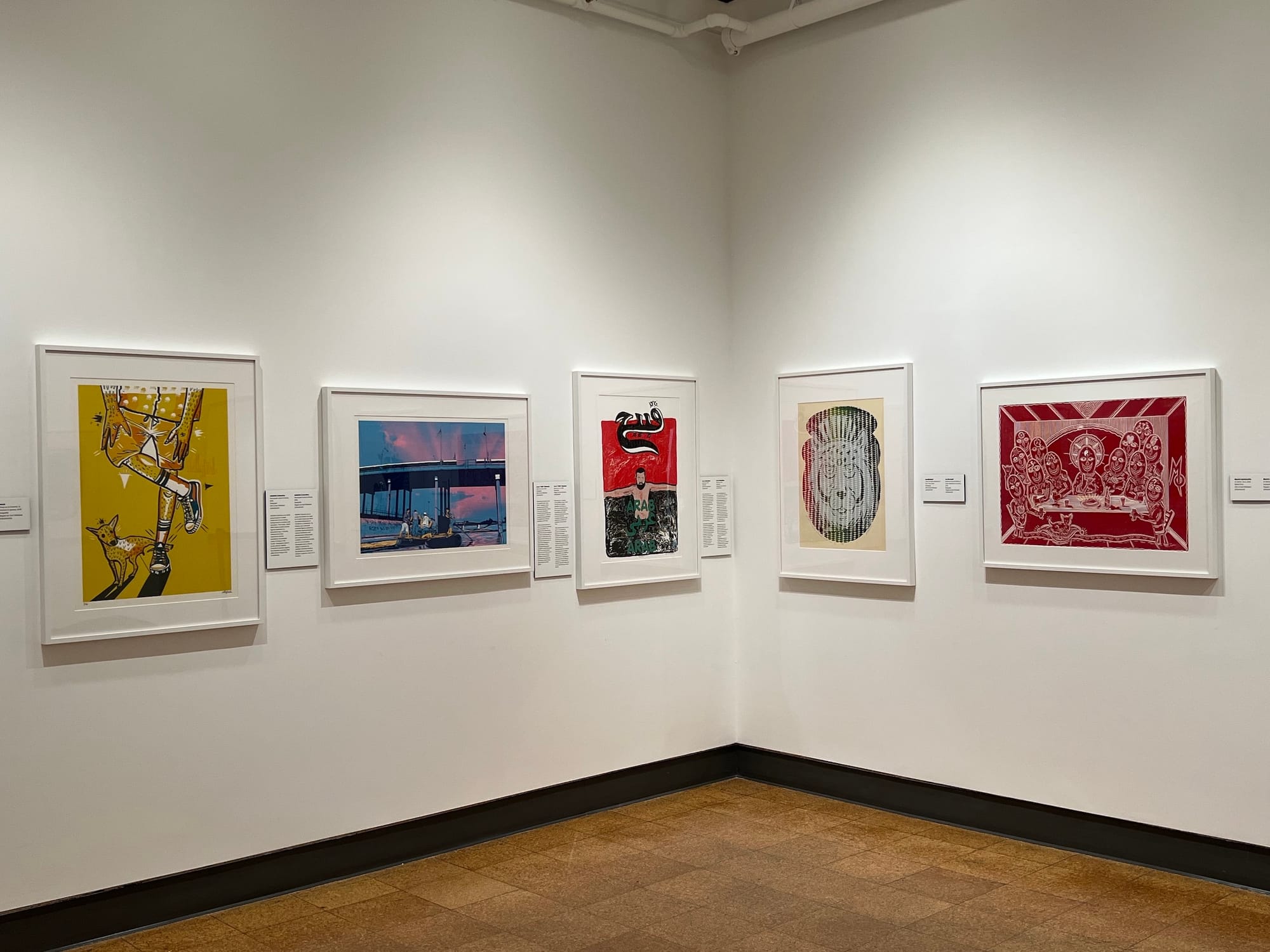 For “Santa Muxe” (serigraph), Mykl Wells imagines a patron saint for the Zapotec people of Oaxaca, Mexico, using three hands to represent three genders. Meanwhile Nanibah Chacon draws on Diné symbols used in weaving to affirm Brown women (“+++,” serigraph), and Victor Muheddine employs Arabic script to counter post-9/11 stereotypes (“Ugly Arab,” serigraph).