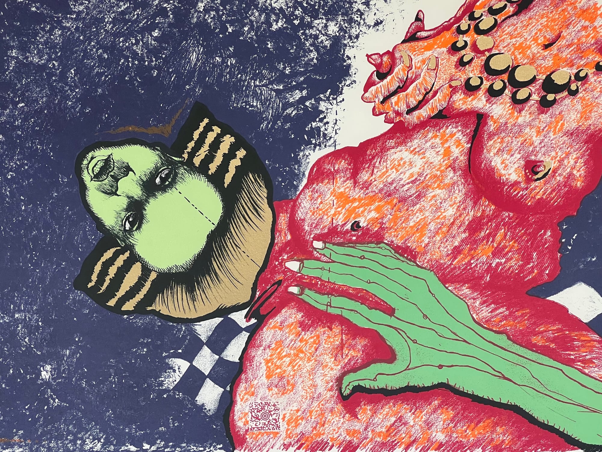 Desert Triangle Print Carpeta features primarily figurative works including serigraphs and relief prints, but also woodcuts, a linocut, and a lithograph. They’re all dated 2016, and printed on 22 by 30-inch paper.