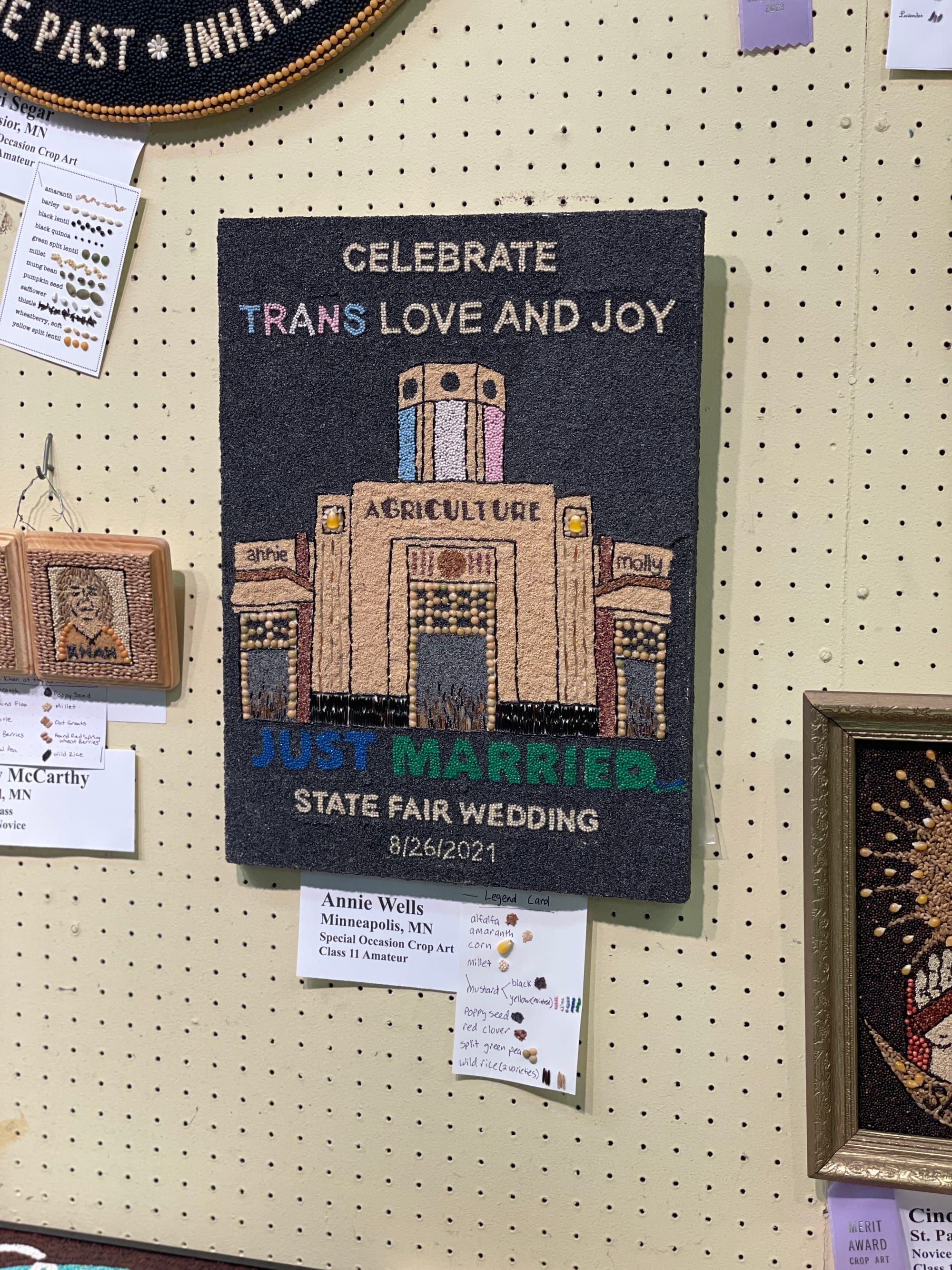 While some sow seeds of discontent, others germinate hope. There were many proud statements of trans joy and pride, both in glued seeds and down the aisle. Queer couple Molly Ritchie and Annie Bulbulian Wells had a "71-second marriage" ceremony in the hallway around the corner, right next to the scarecrows and right under Ron Kelsey's seed bag collection. Wells, who uses they/them pronouns, took up seed art recently and commemorated the ceremony in their work in the show. "With so many terrible things happening to trans people in recent years, I wanted to remind people that trans people love and are loved and that we bring joy into the world,” the artist said.