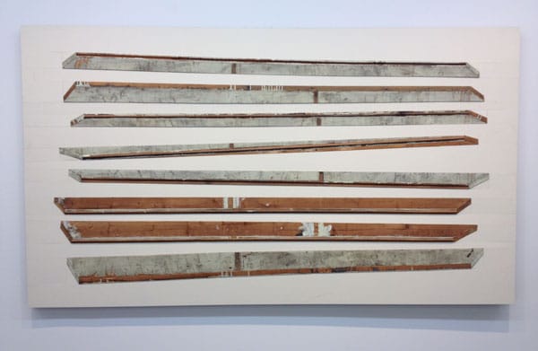 A highlight of the show, “Suspension Boards” (2011), shows the true strengths of Zelehoski’s innovative construction technique by creating a dynamic, dimensional composition. The individual elements appear to shift, twist and rotate perspective independently of one another while existing on the same plane. From a normal viewing distance this work appears to have an eerie dimensionality and realism, but when viewed up-close one can really appreciate the manipulation of perspective and materials in the work. Looking at this work at a close proximity reveals the exhaustive process and attention to detail that went into making these works. Each individual part has been rendered in thin slices of lumber that create a rich, textured hyper-realistic image that really makes it difficult to discern the flat from the three-dimensional. Adding to the delicate lamination of wood, Zelehoski scored lines [SEE CORRECTION BELOW] into the support that extend from the edges of the objects to the edges of the frame. These lines are a considered gesture that first stress the warped perspective of the objects while also filling out the composition of the frame and saving the objects from a potentially boring existence floating in the middle of an empty space.