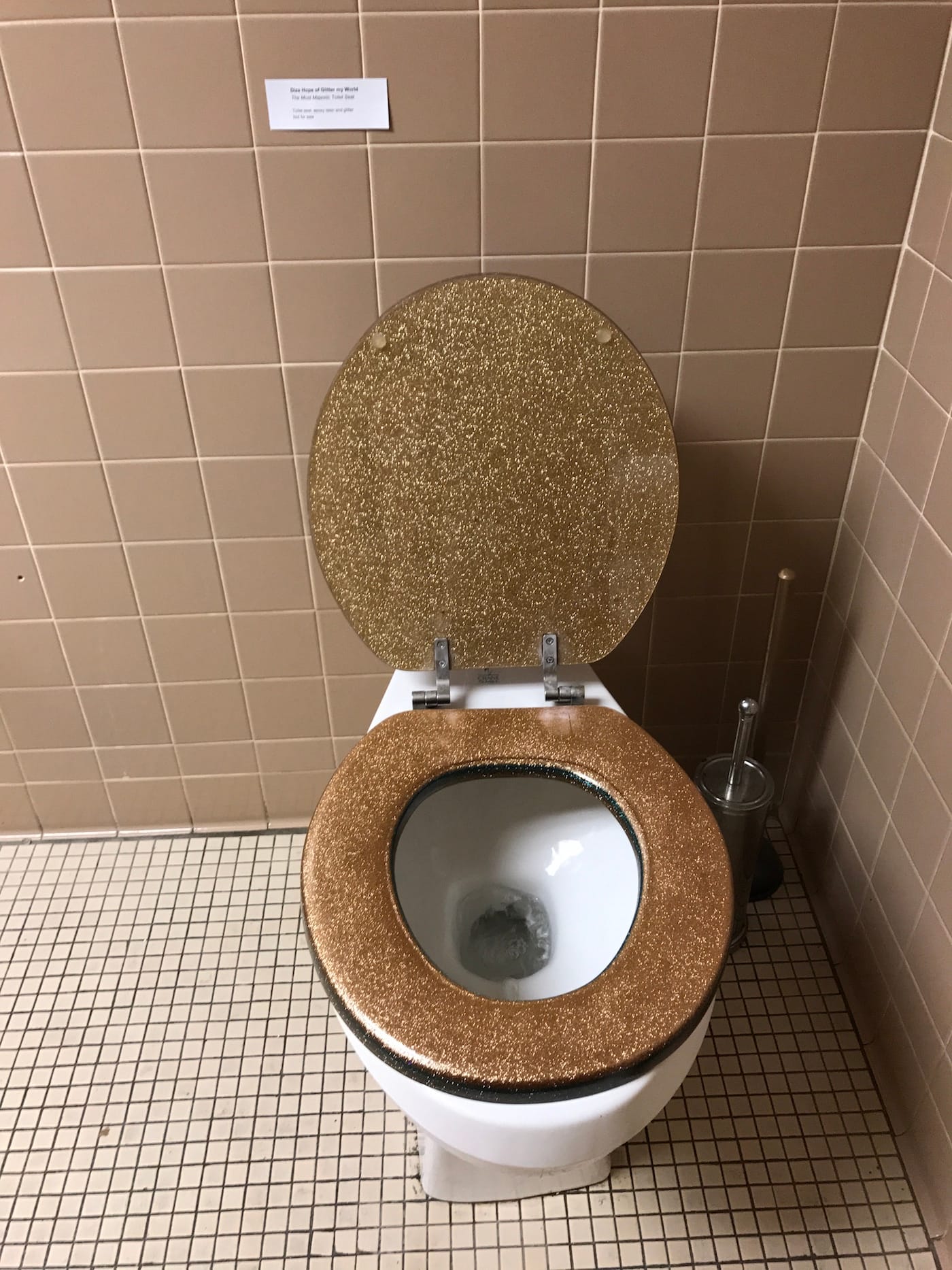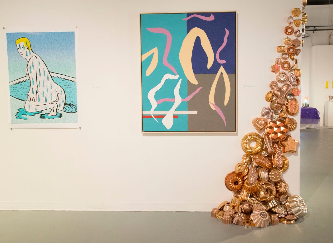 The objects in Miami is Nice run the gamut from something you’d find in a traditional art gallery to home decor. Pink neon and gold glitter proliferates, with a glittery toilet seat designed by Diza Hope that makes even a trip to the loo a special event. A site-specific installation by Gary Godbey, Horan, and Handler features 400 copper Jell-O molds proliferating up a gallery wall and around a corner like a metallic tornado — an over-the-top declaration of domestic ’80s bliss.