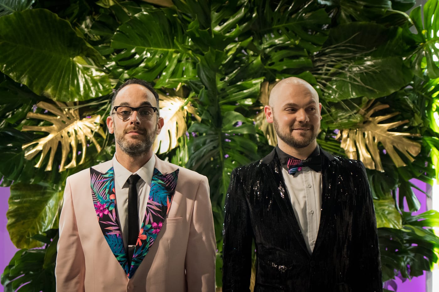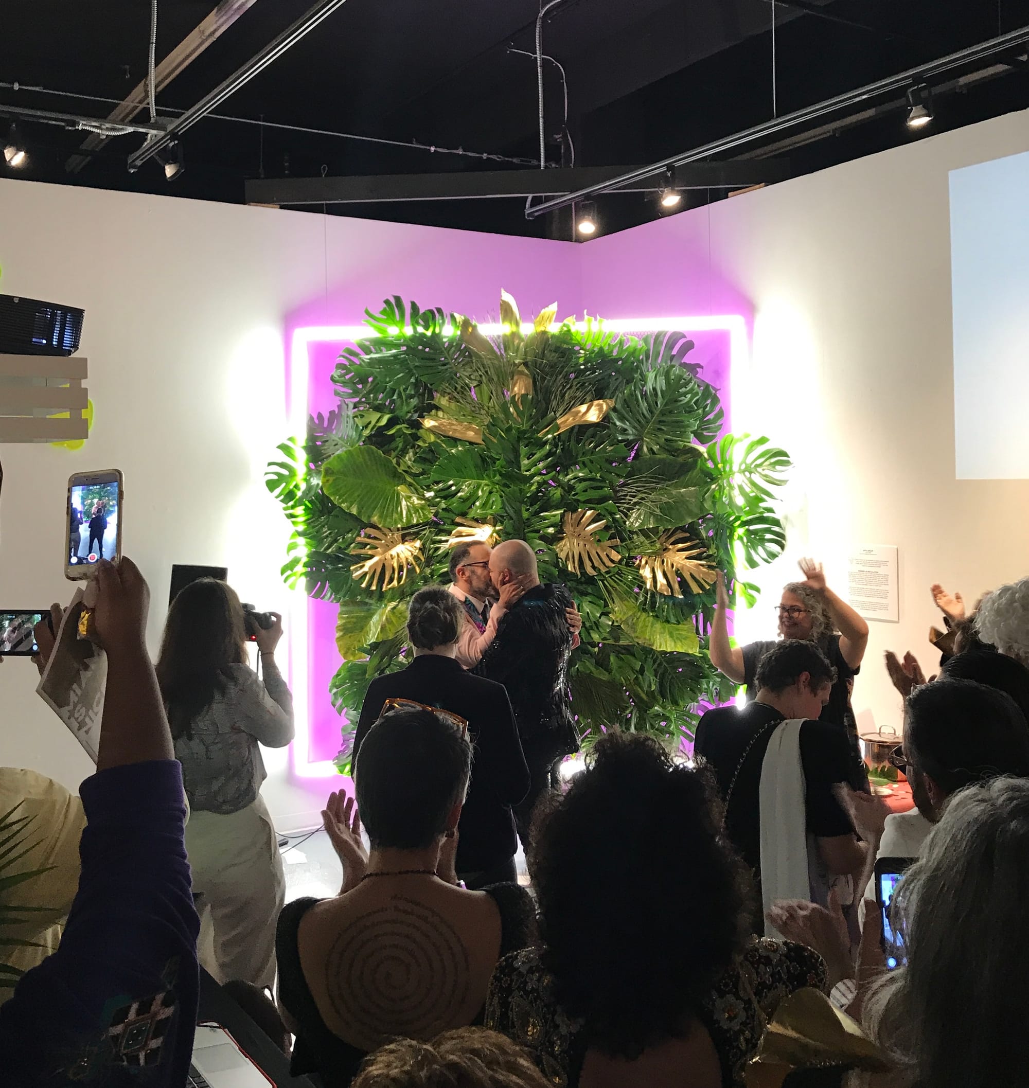 Who better than artists to challenge and reclaim this oppressive system as a unique declaration of love? In Baltimore, two artists have upended the traditional wedding, realizing it as a month-long gallery exhibition and queer performance series. Miami is Nice, hosted at SpaceCamp, a cavernous artist-run gallery, features work by 45 artists from across the country and looks nothing like a traditional wedding, except for the cheesecake station, but manages to celebrate the aesthetics and values of grooms Zachary Z. Handler and Nick Horan in a variety of unique ways.