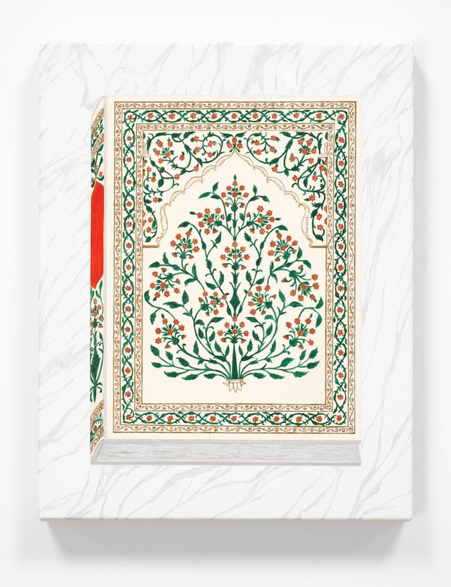 This dense jumble of interior and exterior objects constitutes a canvas-wide window view that doesn’t feel much like a view at all. Jungle-like, the statuary and the trees clog up all available lines of sight. A similar sense of visual plenitude, with minimal unoccupied space, pervades both “Bedroom” and “Bedroom (Rubáiyát of Omar Khayyám),” as well as the smaller “Kensington, Summer” (2010-11), which depicts a backyard garden with a meticulously rendered palimpsest of overgrown greenery. But even in the more aerated canvases, the paintings’ many patterns, textures, and leafy sections still give the sense that something is being camouflaged, hidden, not shown. For example, the background wall in “Living Room (Yogi 2)” (2013), a mostly-white and therefore innocent-seeming room, stops just short of the canvas’ left edge to reveal a peek of the non-white space beyond; like an ever so slightly drawn curtain, it teases with the prospect that as-yet undisclosed secrets might lay behind it.