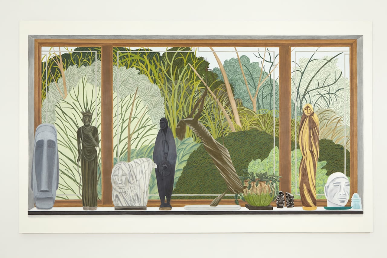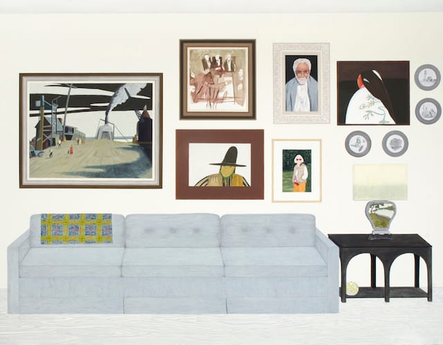 The paintings’ flattened architecture, evocative of early Modernist experiments in non-traditional perspective and of David Hockney’s California pool paintings, contribute to that sense of estrangement. The sense of depth, especially — the rigidly simplified, sometimes gawky furniture; the faintly inaccurate room proportions — is always subtly amiss. This gentle perspectival eccentricity becomes most pronounced in “76 Meadow Woods Road” (2012), wherein numerous interior windowsill decorations sit directly in front of voluminous exterior bushes and trees, with only a minimum of visual depth separating them. Figure and ground collapse, press up against the flattened picture plane in a thicket of greens, browns and grays that contains only nooks and crannies of negative space.