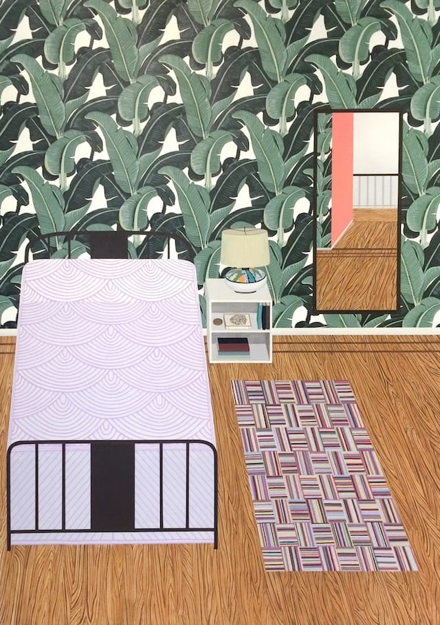 Across the show’s seven large paintings, each of which depicts a household room, Suss achieves differentiation within the canvases through her beguiling use of pattern and texture. With brocades, plaids and foulards, with repeating seashells, fronds and florals, with intricately textured carpets and shrubbery, Suss’s patterned décor, somewhat in the manner of Matisse, introduces bounded vectors of visual energy into otherwise restrained and ordered domestic interiors. At its most extensive, such as in “Bedroom (Rubáiyát of Omar Khayyám)” (2015), the use of pattern and texture encompass nearly the entire surface of the painting, dividing the canvas into contiguous and overlapping rectangles of loud, heterogeneous design. The décor stands out as distinctive, but not always in the flattering way its inhabitants might have hoped.