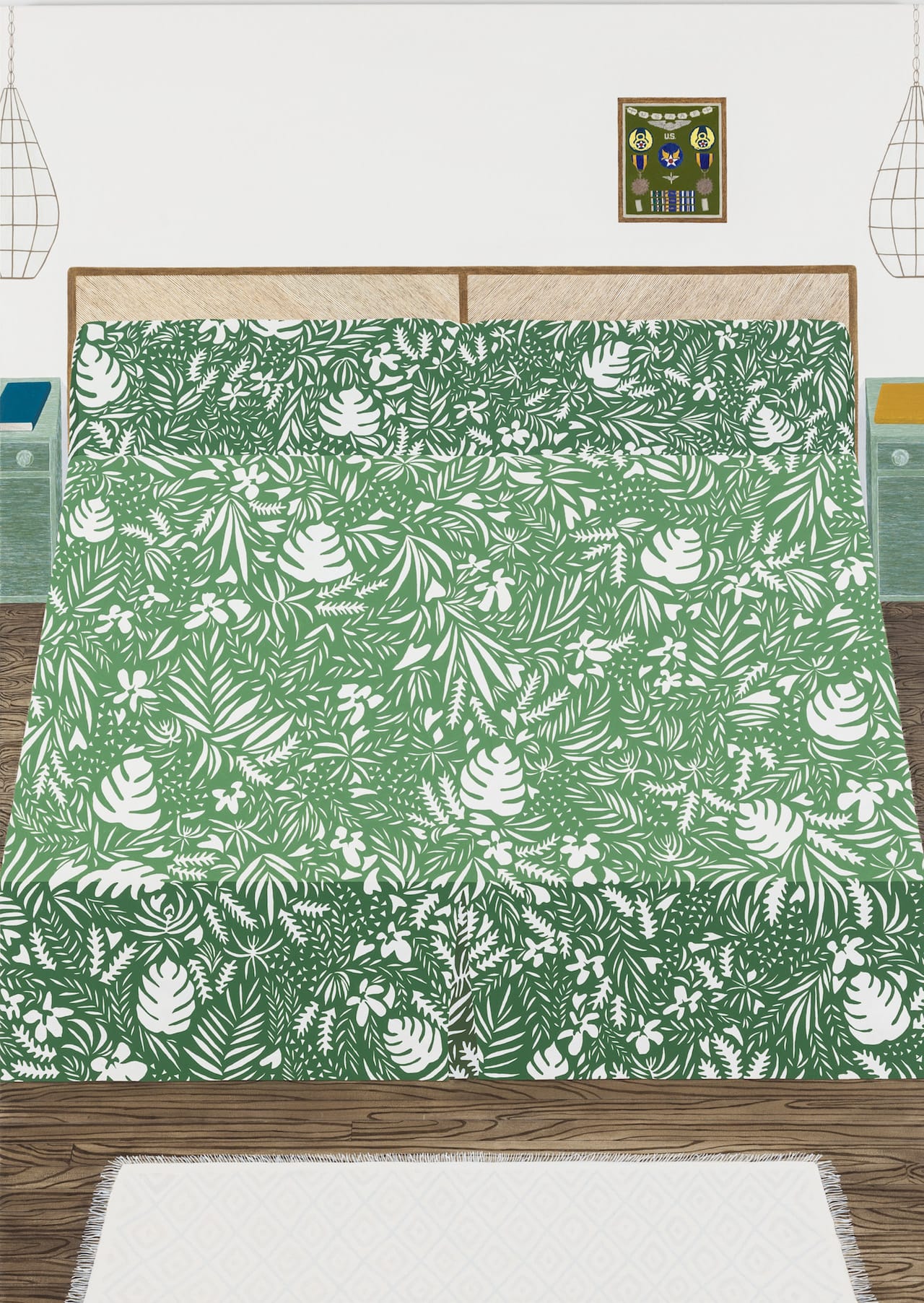 While the depicted décor sometimes verges on questionable taste, Suss’s paintings never do. “Bedroom” (2013), for example, centers on a massive green-and-white leaf-patterned bedspread that occupies a full two-thirds of the canvas. If the bedspread were its own artwork, it would be of a piece with the Pattern and Decoration movement, whose work came to be maligned as over-embroidered during the post-Minimalist ‘80s. But the painting as a whole, with its quiet internal symmetries and deadpan humor, views the ornate bedspread from just enough of a critical remove to endow the work with a visual and intellectual moderation that Pattern and Decoration-influenced works often lack. That critical distance, slight but unmistakable, allows Suss to view the familiar as exotic, rendering her relatives’ rooms beautifully strange.