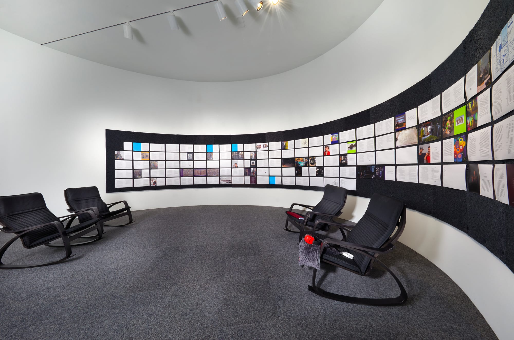 Entering speechless is a bit like walking into a giant nautilus shell. Each chamber curves out away from the center of the space, with a specific installation by an artist or team carefully situated in its own intricate environment. Some of the rooms are dark, like those for Yuri Suzuki’s Sound of the Earth Chapter 2 or Matt Checkowski’s Glyph. Other rooms are brightly lit and vibrant with color, like the tactile room Scroll Space, by Steven and William Ladd, filled with tens of thousands of hand-rolled textile “scrolls” that were made with the help of 1,700 community members in Dallas and Atlanta. In Sound of the Earth Chapter 2, sound is presented as careful, specific, and deliberate. Visitors need to close the physical space between themselves and the dark spherical sculpture in order to hear it “speak” — oracle-like — as they press their ears against the surface of the human-scale sphere. In Glyph, on the other hand, sound is experienced as an ongoing loop of conversations and interviews; the speech from those interviews is then “translated” into images pulled from the internet.