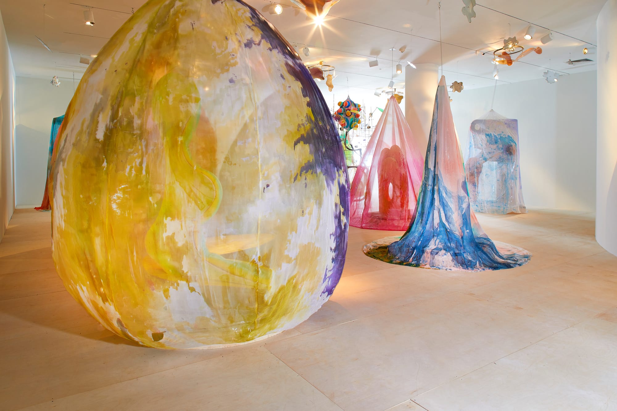 The central theme of speechless is audience participation. Community members made textile scrolls for Scroll Space; the exhibition asks visitors to run their hands over the scrolls recessed in the wall, like a bookshelf in a medieval scriptorium, and wiggle their sock-clad toes over the scrolls in the floor. Anyone can submit audio via the Dallas Museum of Art’s website to be included in Sound of the Earth Chapter 2. Misha Kahn’s billowing garden of “globular silken spider sacs” inflates and deflates throughout the day as museum-goers are encouraged to poke the pieces and even sit on them; given enough time and patience, visitors are literally enveloped by the silks.