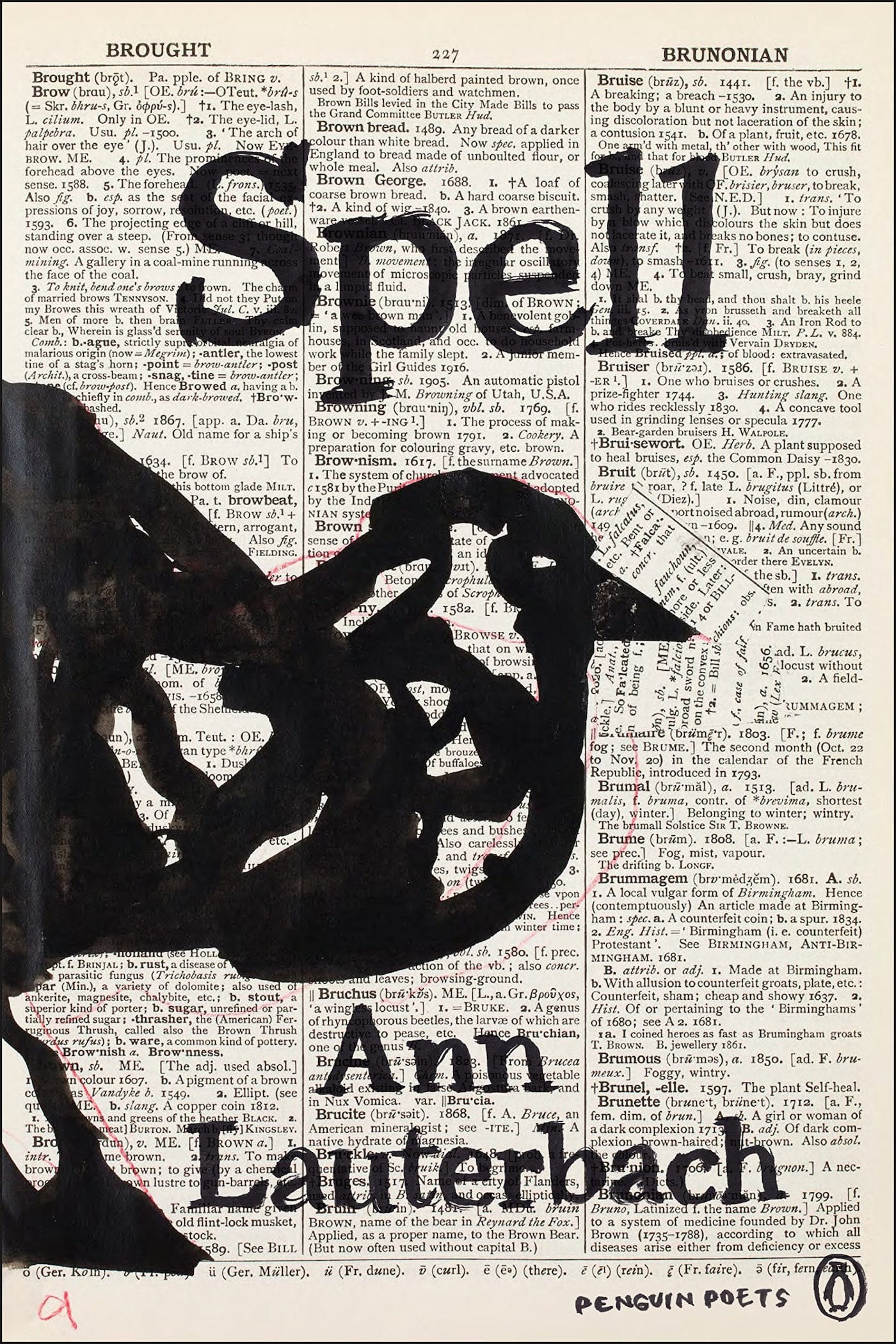 Spell is Ann Lauterbach’s tenth book of poetry. On the front cover is a silhouette of a crow’s head, which William Kentridge has drawn on a page from a dictionary, using a brush loaded with dense black ink. By bringing image and word into inseparable proximity, Kentridge’s drawing calls up the question: what is the relation between word and thing?