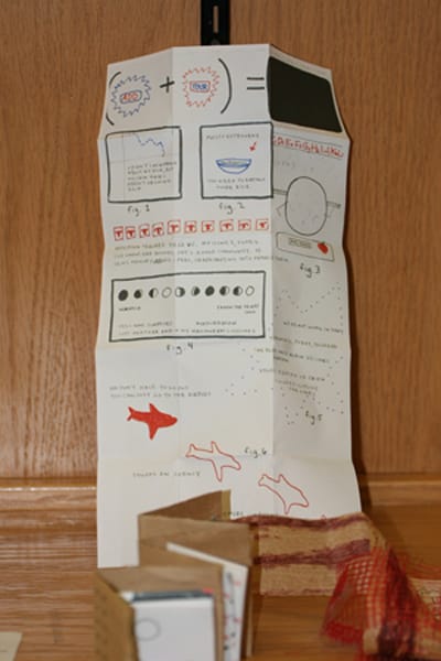 The book is a sandwich of zigzagging brown paper pockets that are stuffed with glossy paper panels — five in all. The 5×11 paper panels are folded 15 times each to the size of small rectangles that slide in and out of the pockets. The whole composition itself resembles the fanning construction of a “Jacobs ladder” wooden toy. Opening a panel is the literal unfolding of story, the story of Spiderboi, a gender-riffic character that draws from the power of spiders and their web — a riff off Spiderman.