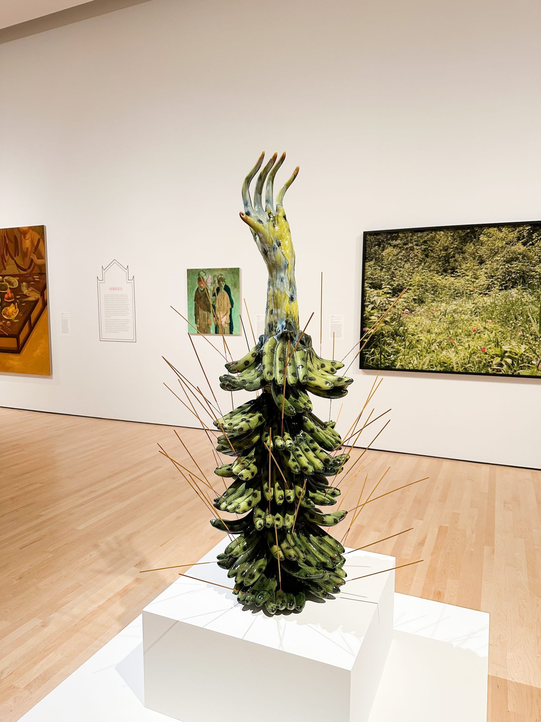 Kelly Akashi’s bronze and glass casts of her own hand wear her grandmother’s jewelry or hold natural elements such as twigs, stones, or pinecones scavenged from Poston, Arizona, the site of a detention camp where the artist’s family was incarcerated. According to her research, many of the pines that stand today were originally planted by some of those incarcerated Japanese Americans, and they serve as solemn monuments to a painful history. Akashi’s colored glass sculptures, such as “Inheritance” (2022), seem to glow, as if this act of casting can transform her physical body into a spirit in order to reach across time to touch this moment in her family’s history.