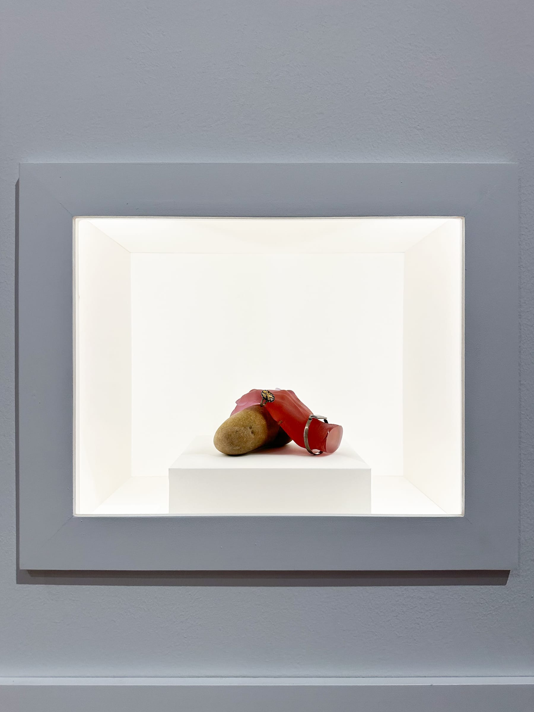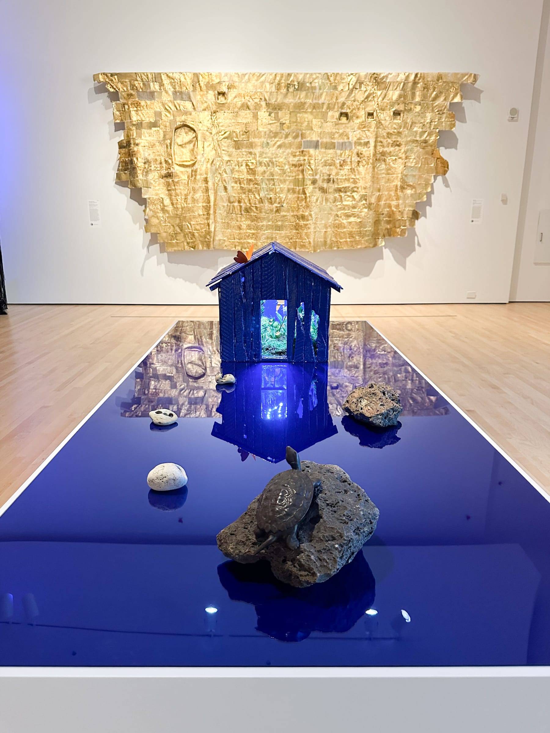 Many of the artists in Spirit House have family stories that are intimately connected with one of the several collective traumas experienced by Asians and Asian Americans in the last century. The central structure in Greg Ito’s “The Weight of Your Shadow” (2023) is a small building that evokes the barracks where Japanese Americans, like Ito’s grandparents, were incarcerated by the United States during World War II. The building is surrounded by family heirlooms from the artist’s grandmother and placed on a reflective blue surface. In the work viewers literally see themselves alongside Ito’s history, showing how our own identities are braided together with the stories of our families, communities, and ancestors.